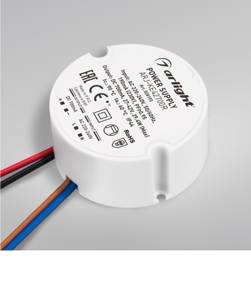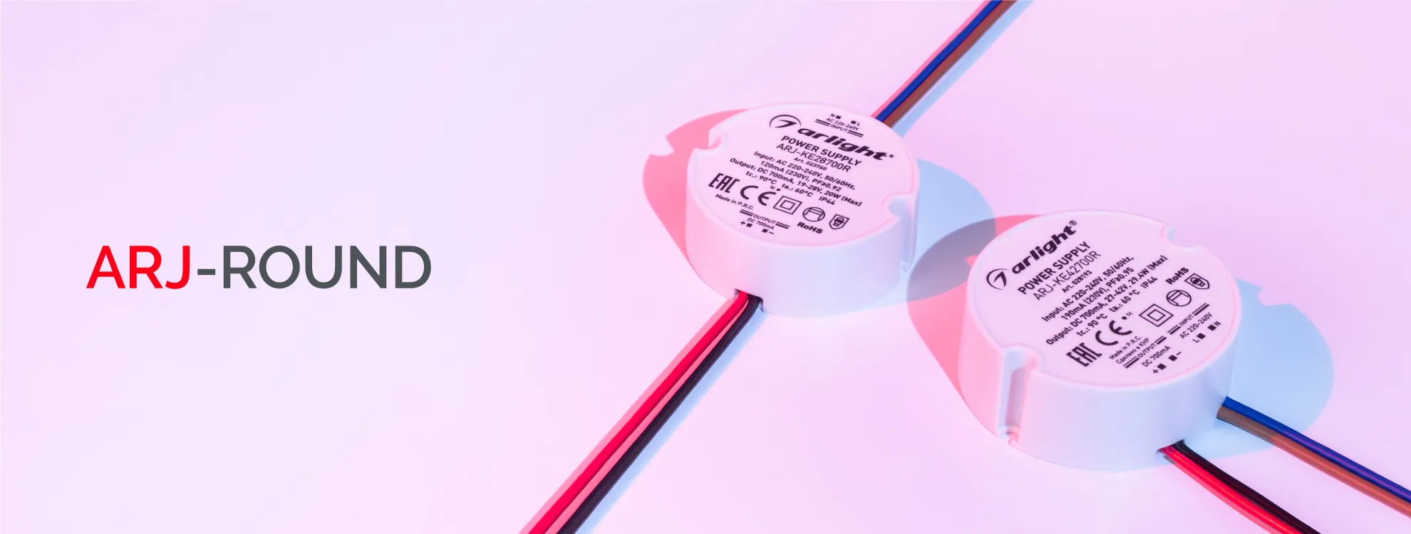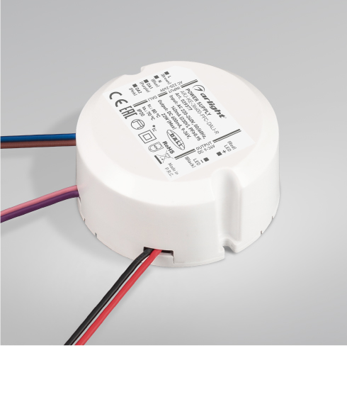 Источники питания ARJ-ROUND в круглом пластиковом корпусе предназначены для питания светодиодов, светодиодных светильников и других устройств, имеющих питание фиксированным током.