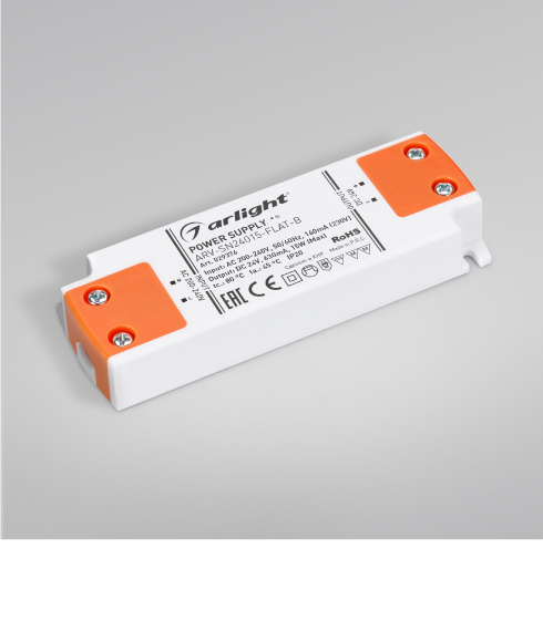 Блок питания ARV-SP-24015-FLAT-B (24V, 0.63A, 15W) (Arlight, IP20 Пластик, 5 лет)