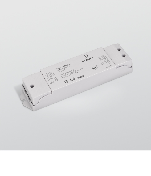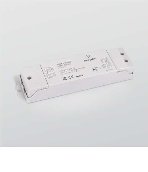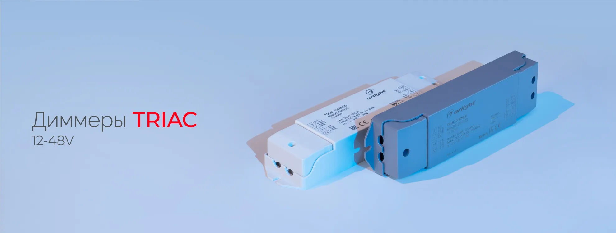 Диммеры TRIAC предназначены для включения, выключения и регулировки яркости различных светодиодных источников света с напряжением питания 12–48 В, таких как светодиодные ленты, линейные прожекторы и другие устройства, поддерживающие управление симисторными светорегуляторами.