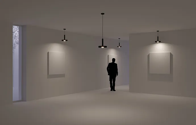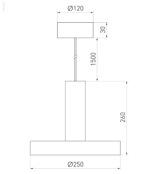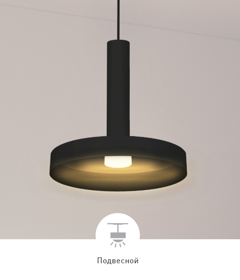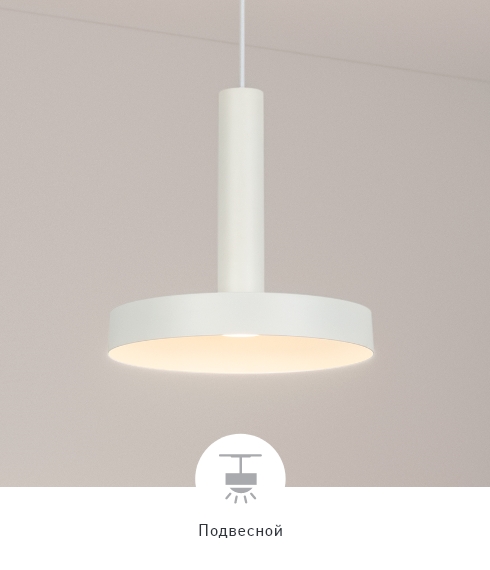 Черные и белые корпуса диаметром 250 мм на регулируемом тросе. Светильники мощностью 8 Вт.