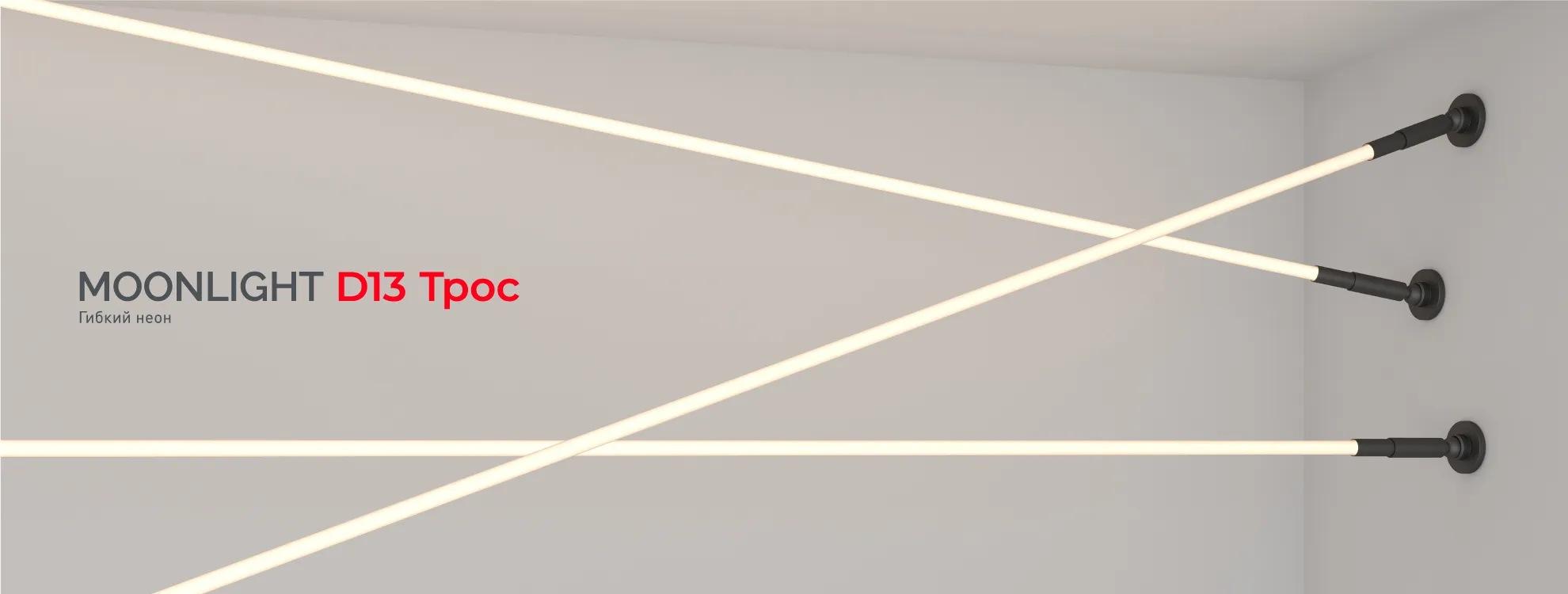 Гибкий неон MOONLIGHT D13 со специальным регулирующим тросом внутри предназначен для создания декоративной подсветки и световых 3D-инсталляций. Благодаря небольшому диаметру (всего 13 мм) он отлично подходит для оформления ниш и элементов мебели.