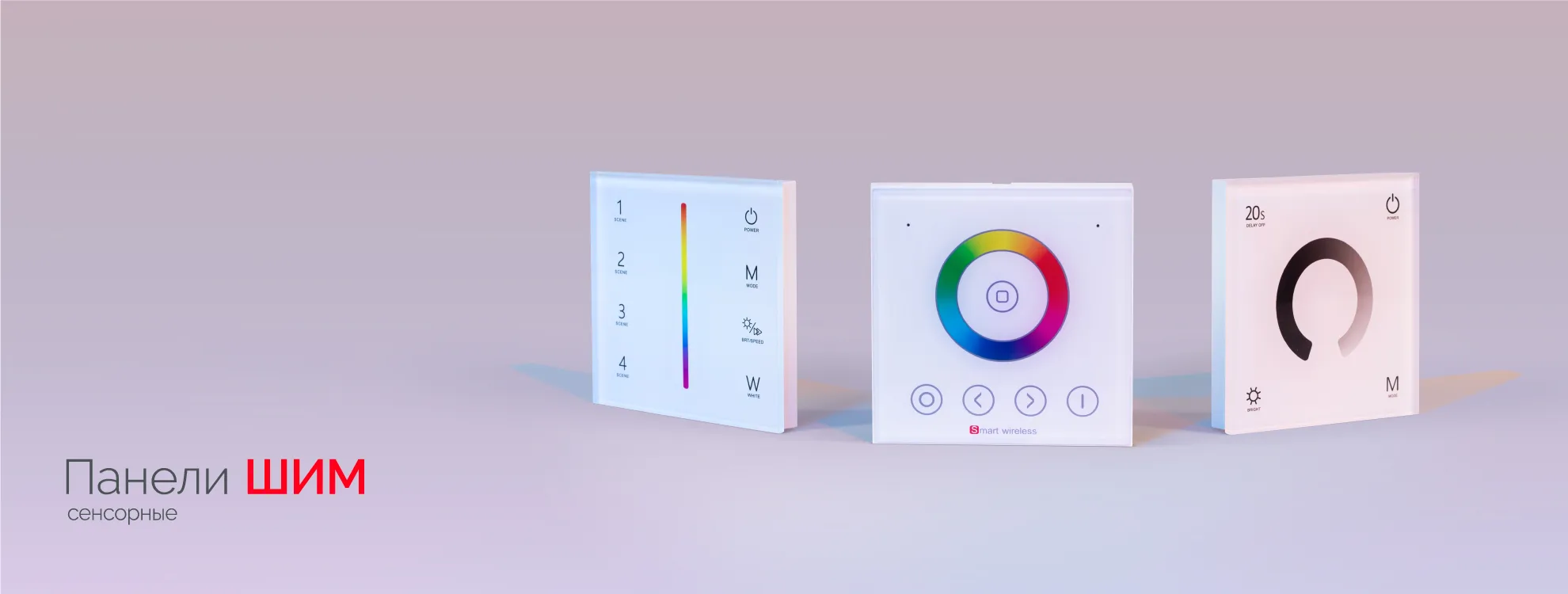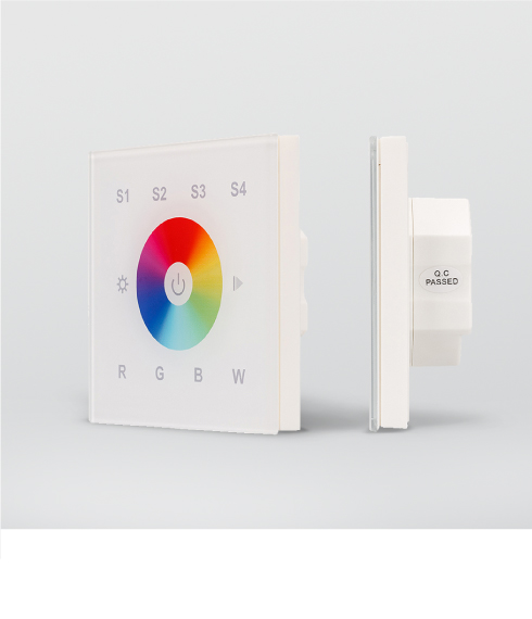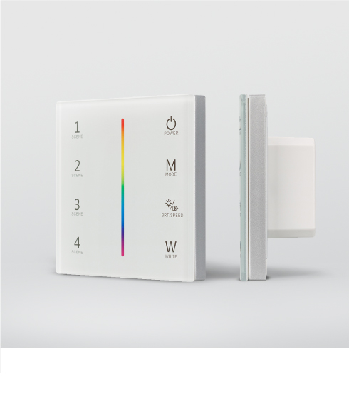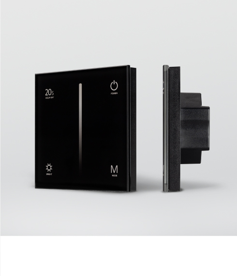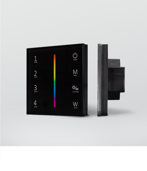 Настенные сенсорные панели со стеклянным покрытием встраиваются в стандартную распределительную коробку и позволяют управлять одноцветной светодиодной лентой — включать, выключать и регулировать яркость свечения.