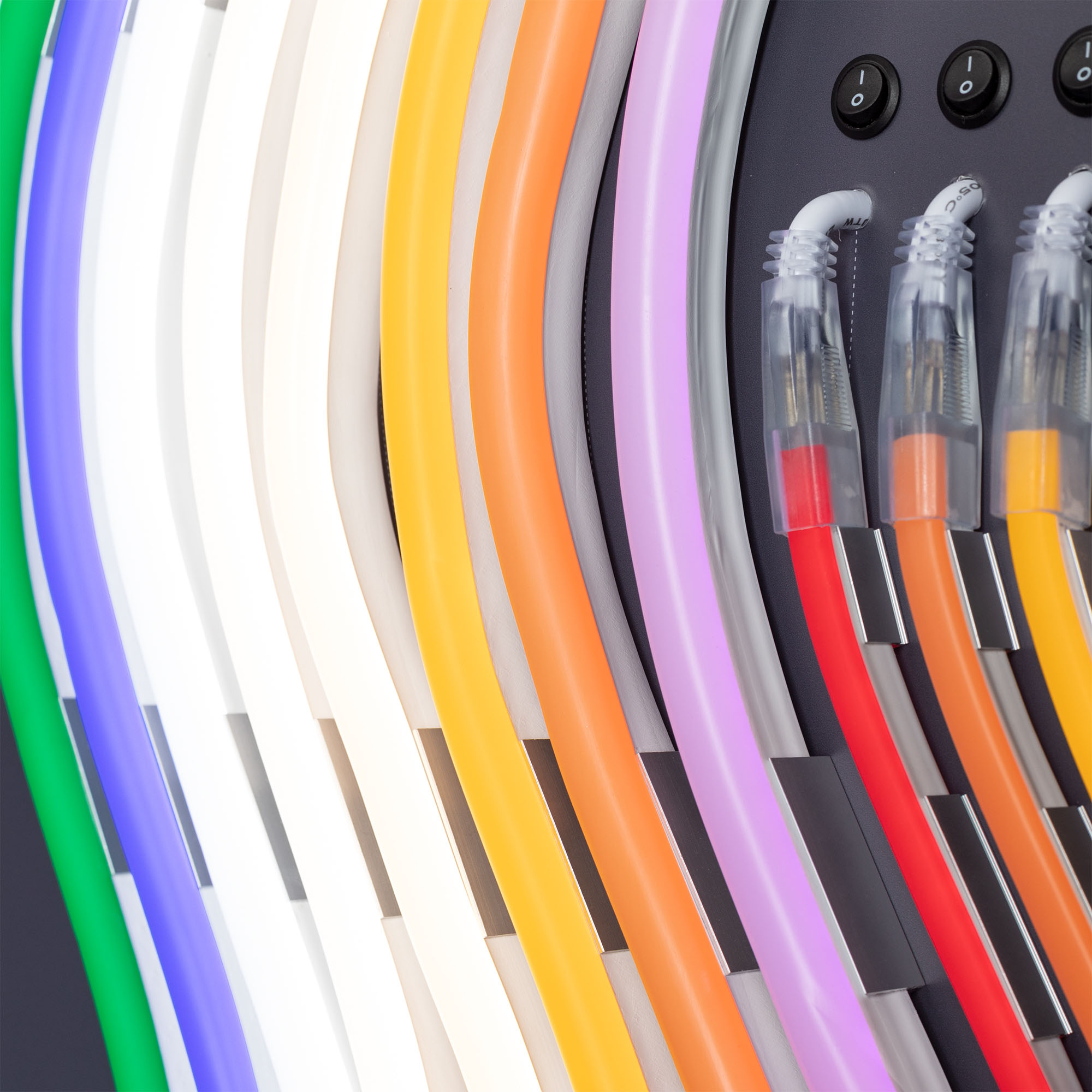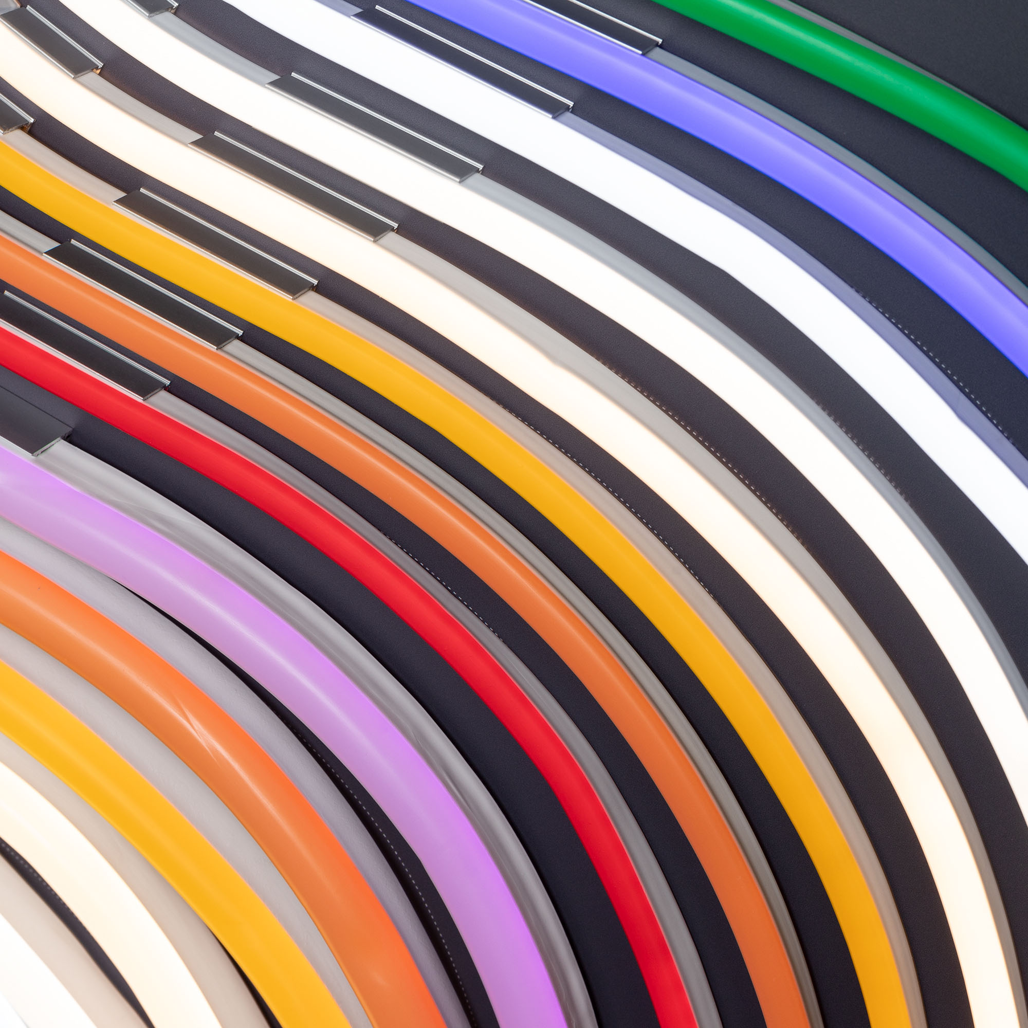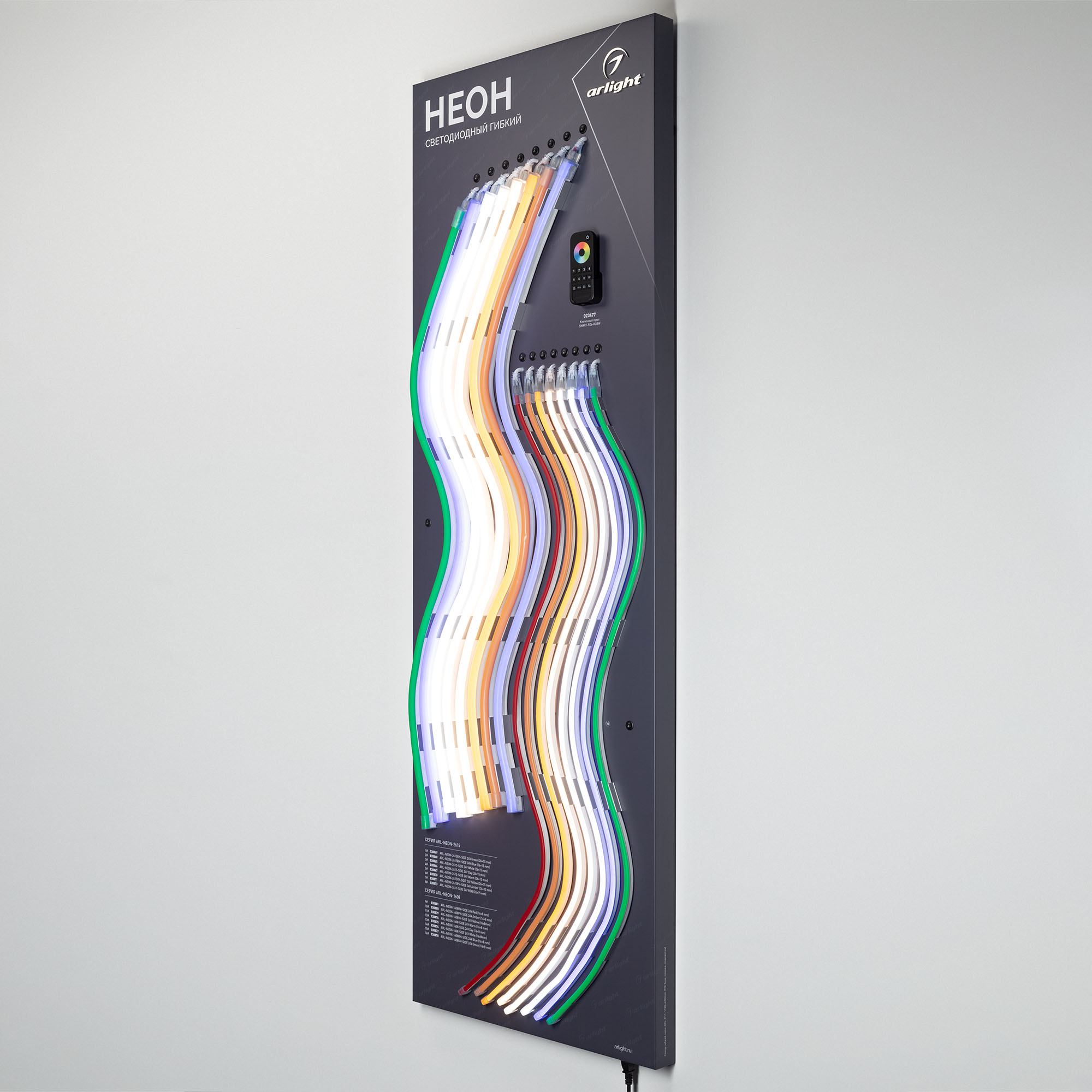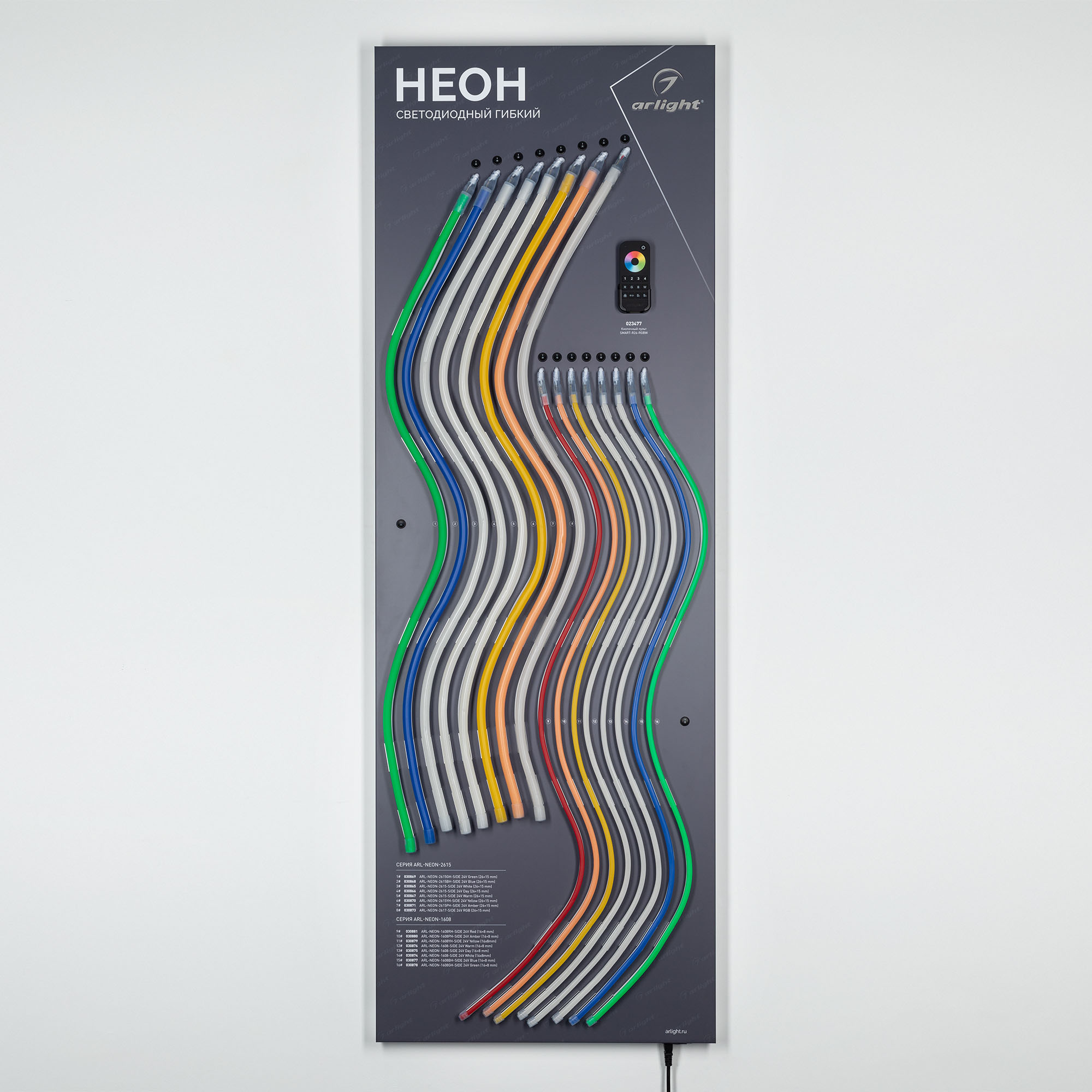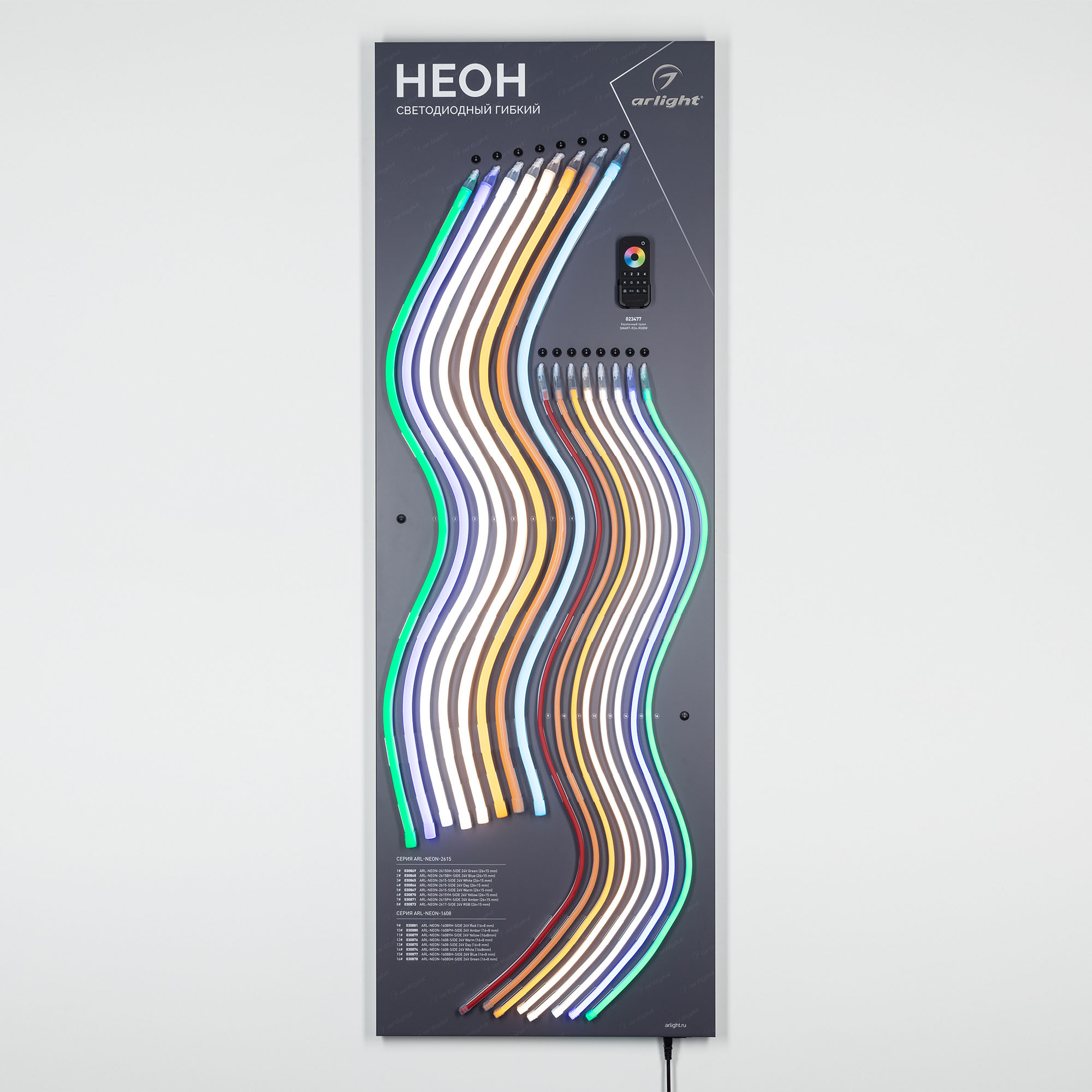 На стенде представлен классический светодиодный гибкий неон c возможностью бокового изгиба различных цветов, а также модель RGB с возможностью ручной регулировки цвета.