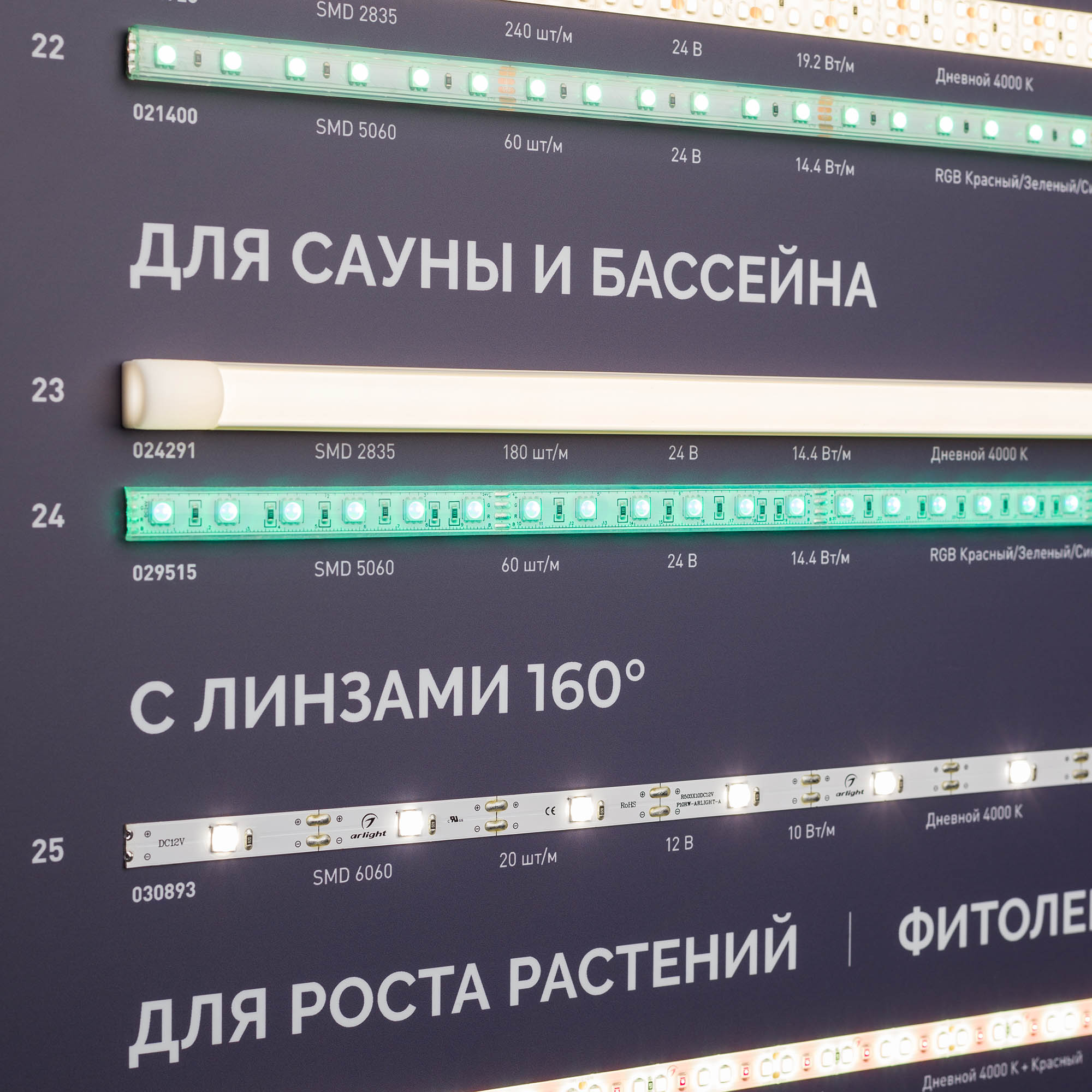 Стенд светодиодные ленты Специализированные - узкие, герметичные, волна и другие 12/24В, 30 моделей (ряды #60-#89). Материал - композит 3 мм, пленка, печать. Габаритные размеры (Ширина Х Высота Х Глубина), 600х1760х60 мм. Питание 230 В. Мощность 160 Вт.