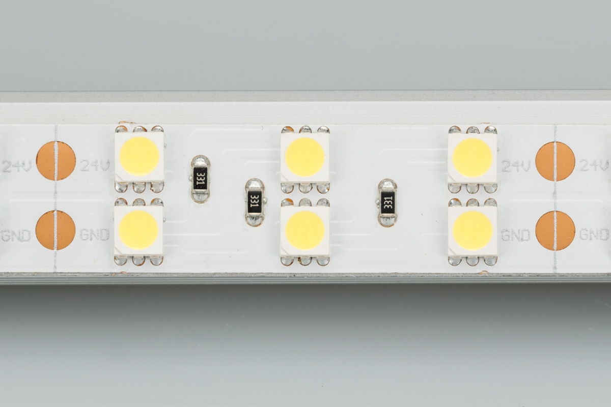 Гибкая лента LUX, 2 ряда светодиодов smd 5060, 120шт/м (600шт на 5м), белая плата 15мм, скотч 3М. Цвет ДНЕВНОЙ 3800-4200K. Питание 24V, мощность 28.8 Вт/м (144 Вт на 5м), угол 120°, цветопередача CRI>85. Размеры 5000х15х2.2мм. Мин.отрезок 50мм, 6 светодиодов. Цена за 1м.