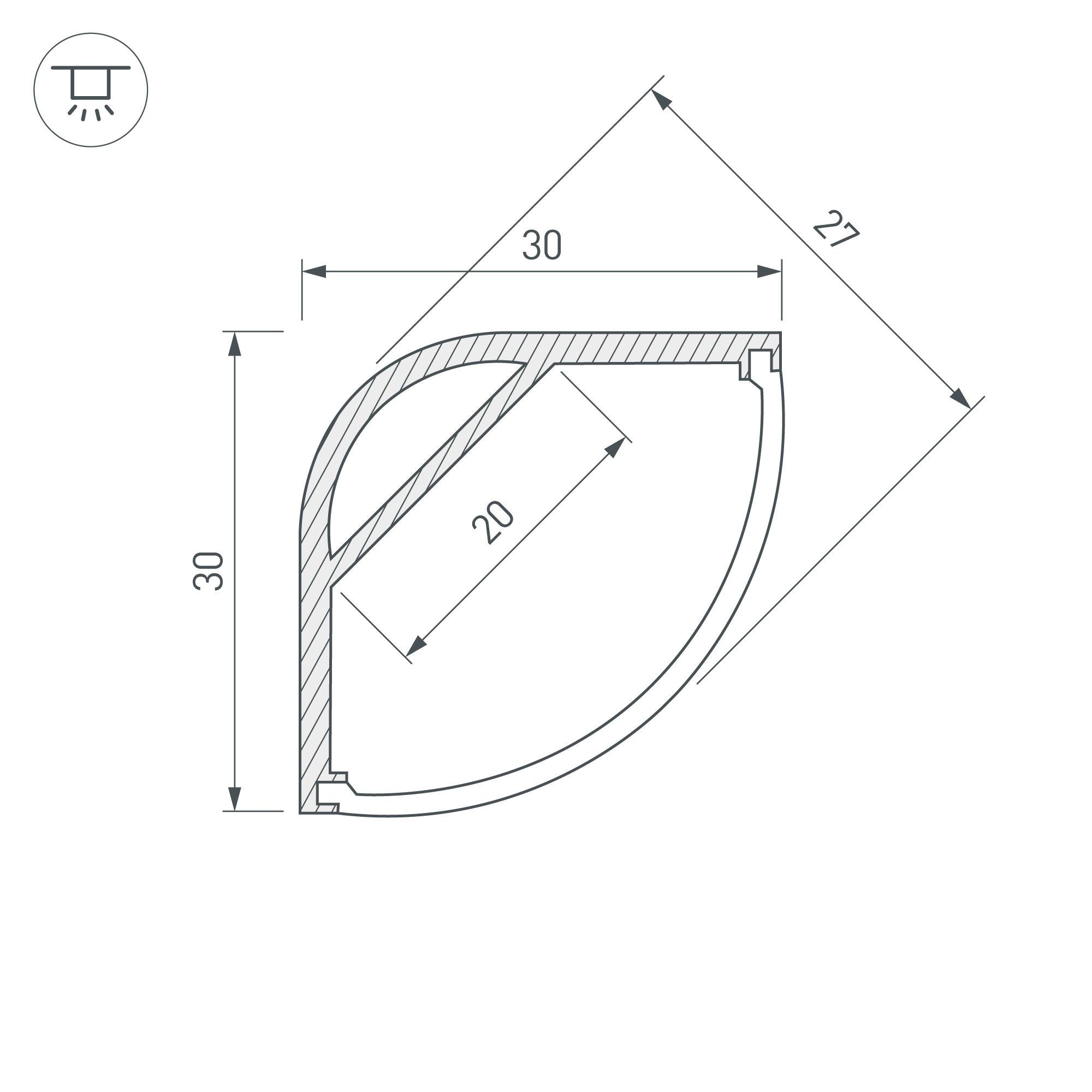 Алюминиевый анодированный угловой профиль для светодиодных лент и линеек. Скругленный угол профиля позволяет достичь высокой точности установки при любых неровностях. Габаритные размеры (L×W×H): 2000x30x30 мм. Ширина площадки для ленты 20 мм. Экраны, заглушки и другие аксессуары приобретаются отдельно. Цена за 1 метр.
