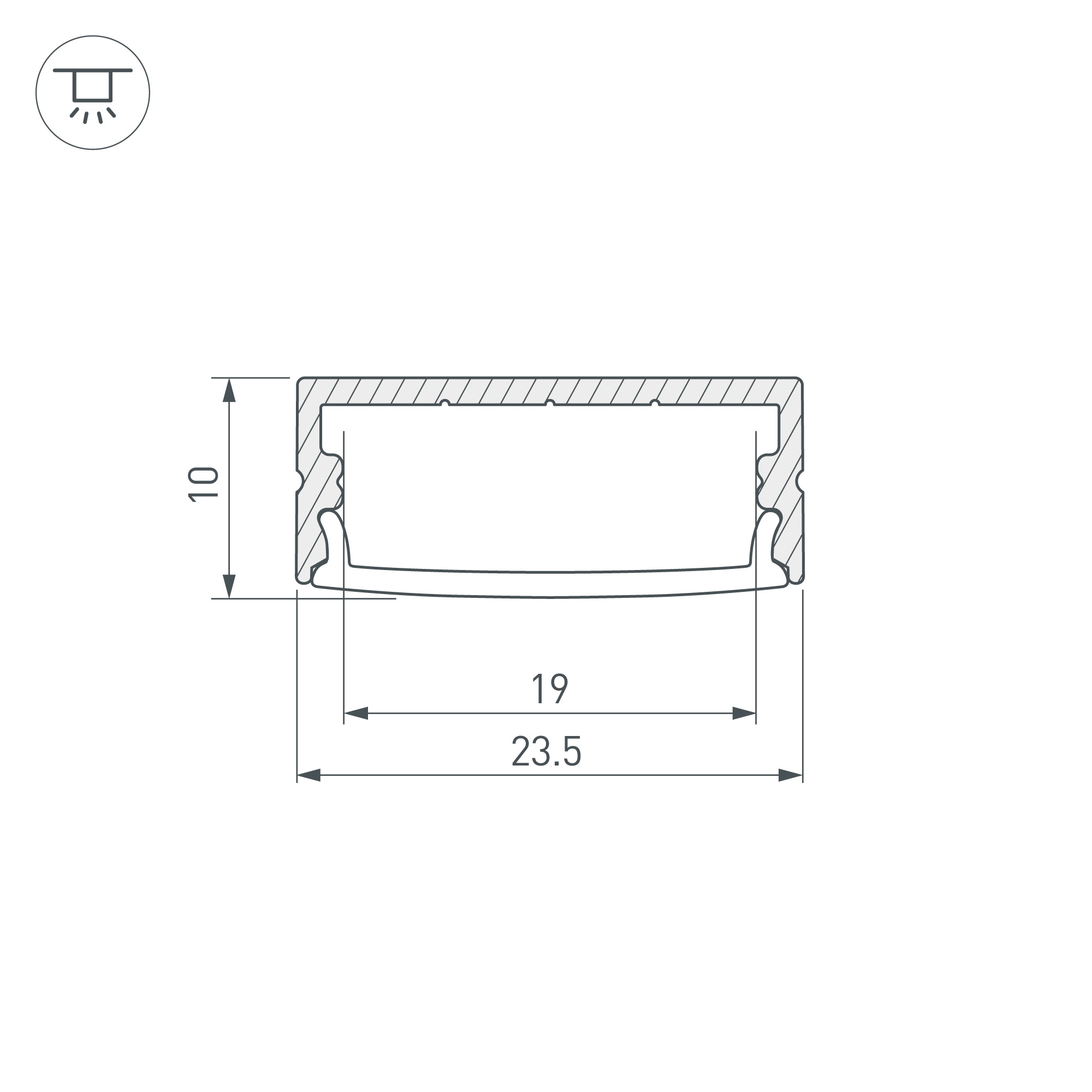Накладной профиль из анодированного алюминия для контурной подсветки элементов интерьера. Габаритные размеры профиля составляют 2000 мм в длину, 23,5 мм в ширину и 10 мм в высоту. Площадка для установки светодиодных лент позволяет использовать ленту шириной до 19 мм и мощностью до 17,5 Вт/м. Это обеспечивает гибкость в выборе светодиодных лент и создает потрясающие световые решения.