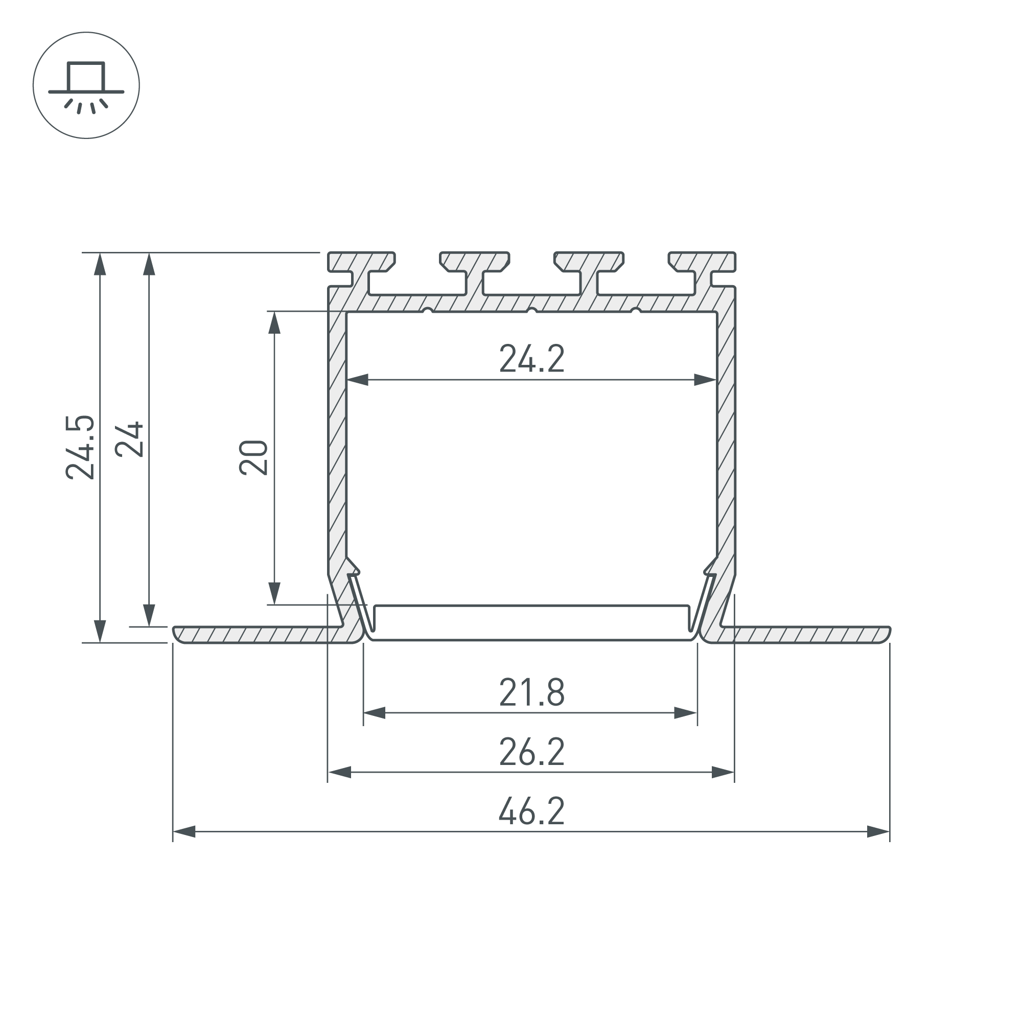 Встраиваемый профиль с накладным фланцем из анодированного алюминия для основного освещения и контурной подсветки. Габаритные размеры профиля составляют 2000 мм в длину, 46,2 мм в ширину и 24,5 мм в высоту. Площадка для установки светодиодных лент позволяет использовать ленту шириной до 24,2 мм и мощностью до 33,2 Вт/м. Это обеспечивает гибкость в выборе светодиодных лент и создает потрясающие световые решения. Экраны, заглушки и другие аксессуары не включены в комплект и приобретаются отдельно. Цена указана за 1 метр профиля. Отличное решение для создания современных световых проектов.