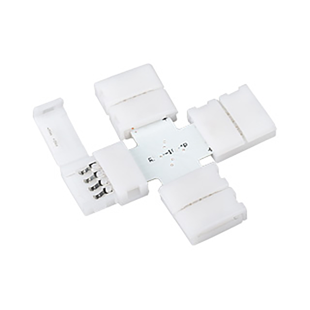 Крестовой разветвитель с разъемами на фиксаторах для соединения RGB-лент шириной 10 мм. Максимальный допустимый ток 4 А. Не рекомендуется соединять длинные отрезки лент.