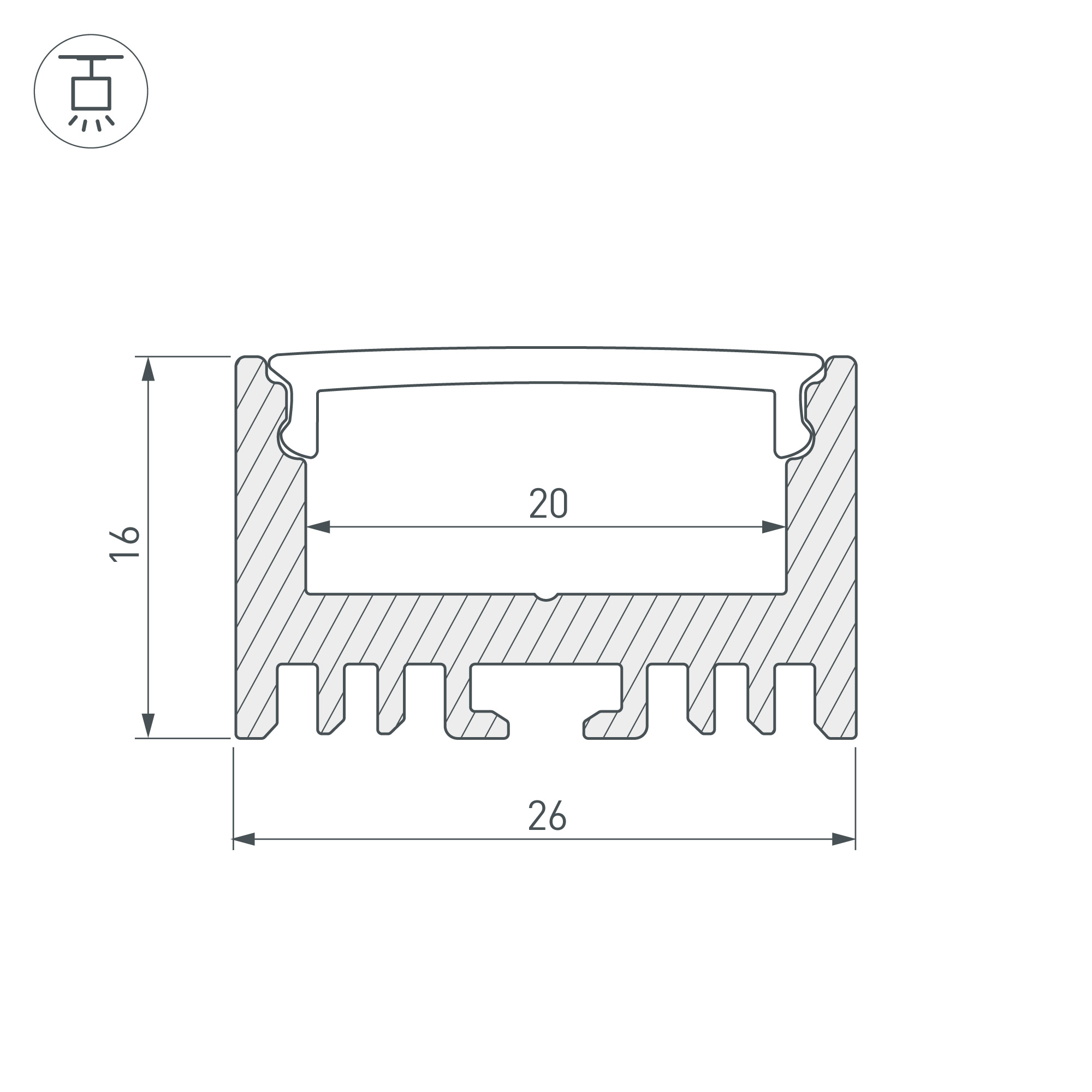 Подвесной профиль из анодированного алюминия для контурной подсветки элементов интерьера. Габаритные размеры профиля составляют 2000 мм в длину, 26 мм в ширину и 16 мм в высоту. Площадка для установки светодиодных лент позволяет использовать ленту шириной до 20 мм и мощностью до 22 Вт/м. Это обеспечивает гибкость в выборе светодиодных лент и создает потрясающие световые решения.