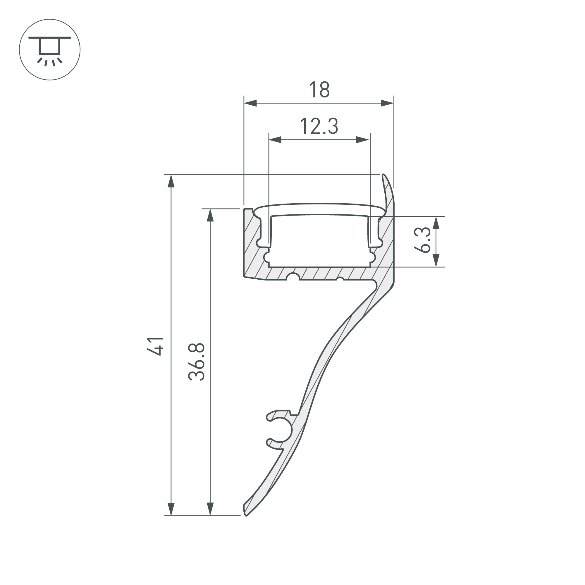 Габаритные размеры профиля составляют 2000 мм в длину, 41 мм в ширину и 18 мм в высоту. Площадка для установки светодиодных лент позволяет использовать ленту шириной до 12 мм и мощностью до 44 Вт/м. Это обеспечивает гибкость в выборе светодиодных лент и создает потрясающие световые решения.
