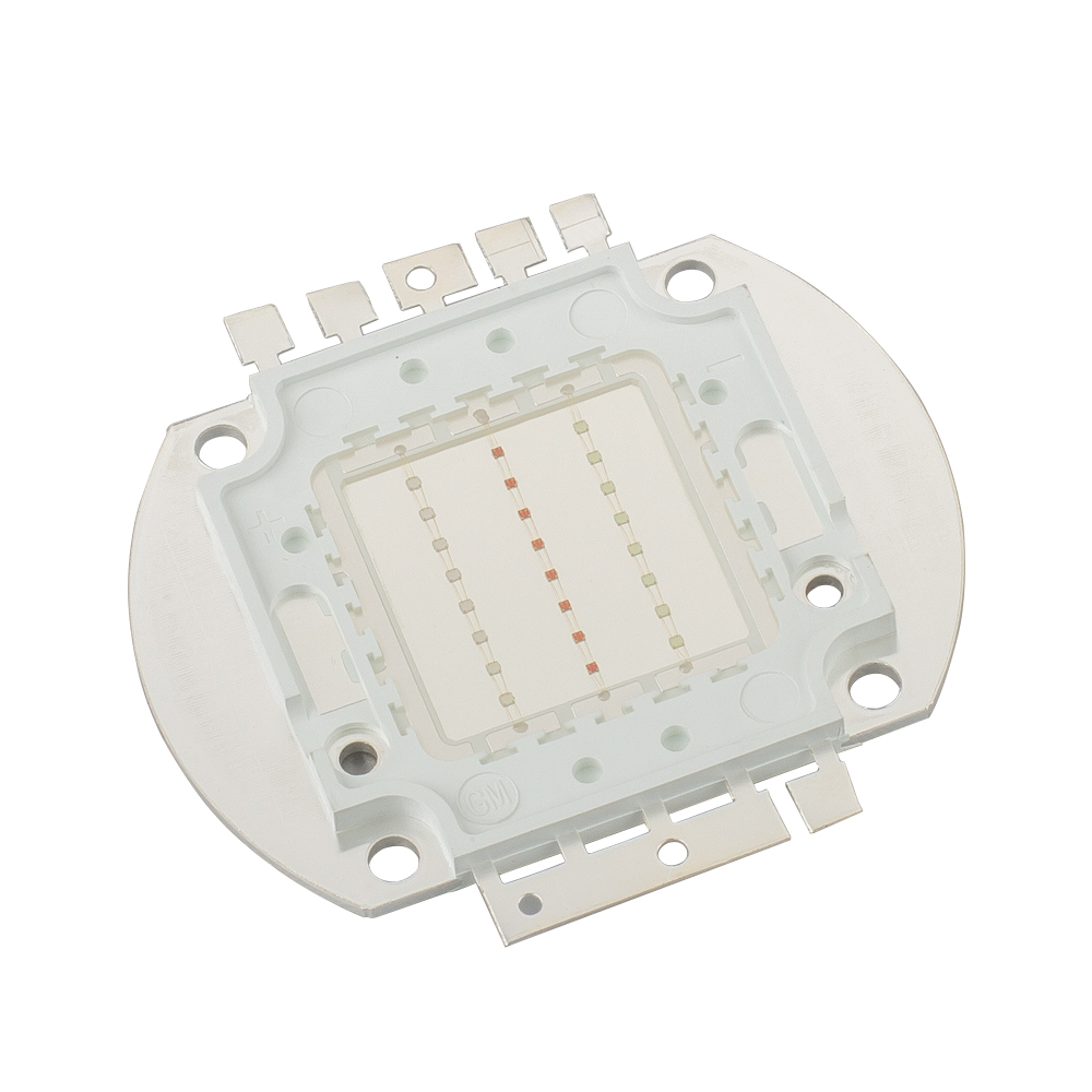 Поставка под заказ от 100 шт. Мощный светодиод типа COB, размер 52×56 мм. Чипы EPILEDS 32-35 mil. Цвет свечения RGB: красный (620-630 нм), зеленый (520-530 нм), синий (460-470 нм). Угол излучения 120°. Световой поток 350-400 лм (красный), 500-550 лм (зеленый), 140-180 лм (синий) при If=350 мА, P=24 Вт. VF=16-20 В (красный), VF= 24-28 В (зеленый/синий). Управляется RGB контроллером тока, или любым RGB-контроллером через конвертор сигнала напряжения в ток.