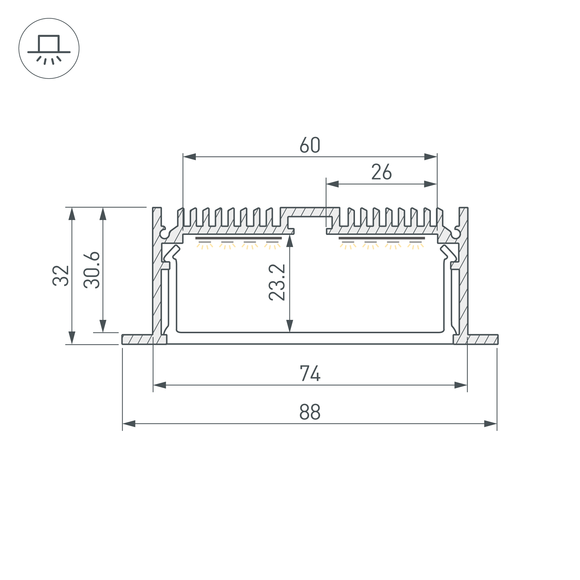 Встраиваемый профиль белого цвета с накладным фланцем из алюминия в комплекте с матовым рассеивателем со светопропусканием 65% и заглушками идеально подходит для основного освещения и контурной подсветки. Габаритные размеры профиля составляют 2500 мм в длину, 88 мм в ширину и 32 мм в высоту. Площадка для установки светодиодных лент позволяет использовать ленту шириной до 60 мм и мощностью до 59,7 Вт/м. Это обеспечивает гибкость в выборе светодиодных лент и создает потрясающие световые решения. Заглушки и другие аксессуары не включены в комплект и приобретаются отдельно. Цена указана за комплект. Отличное решение для создания современных световых проектов.