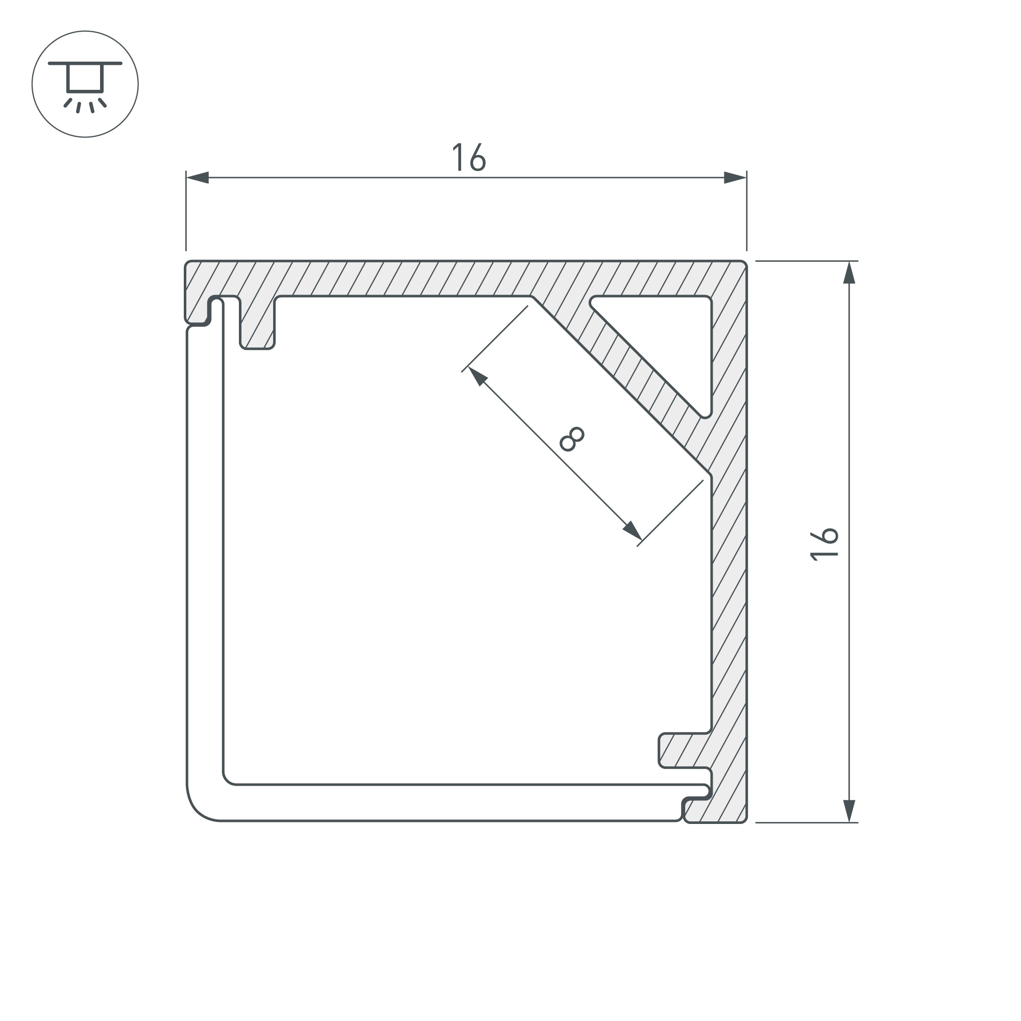 Накладной угловой профиль из анодированного алюминия для подсветки мебели, пазов, ниш и других элементов интерьера. Габаритные размеры профиля составляют 2000 мм в длину, 16 мм в ширину и 16 мм в высоту. Площадка для установки светодиодных лент позволяет использовать ленту шириной до 8 мм и мощностью до 14,5 Вт/м. Это обеспечивает гибкость в выборе светодиодных лент и создает потрясающие световые решения.