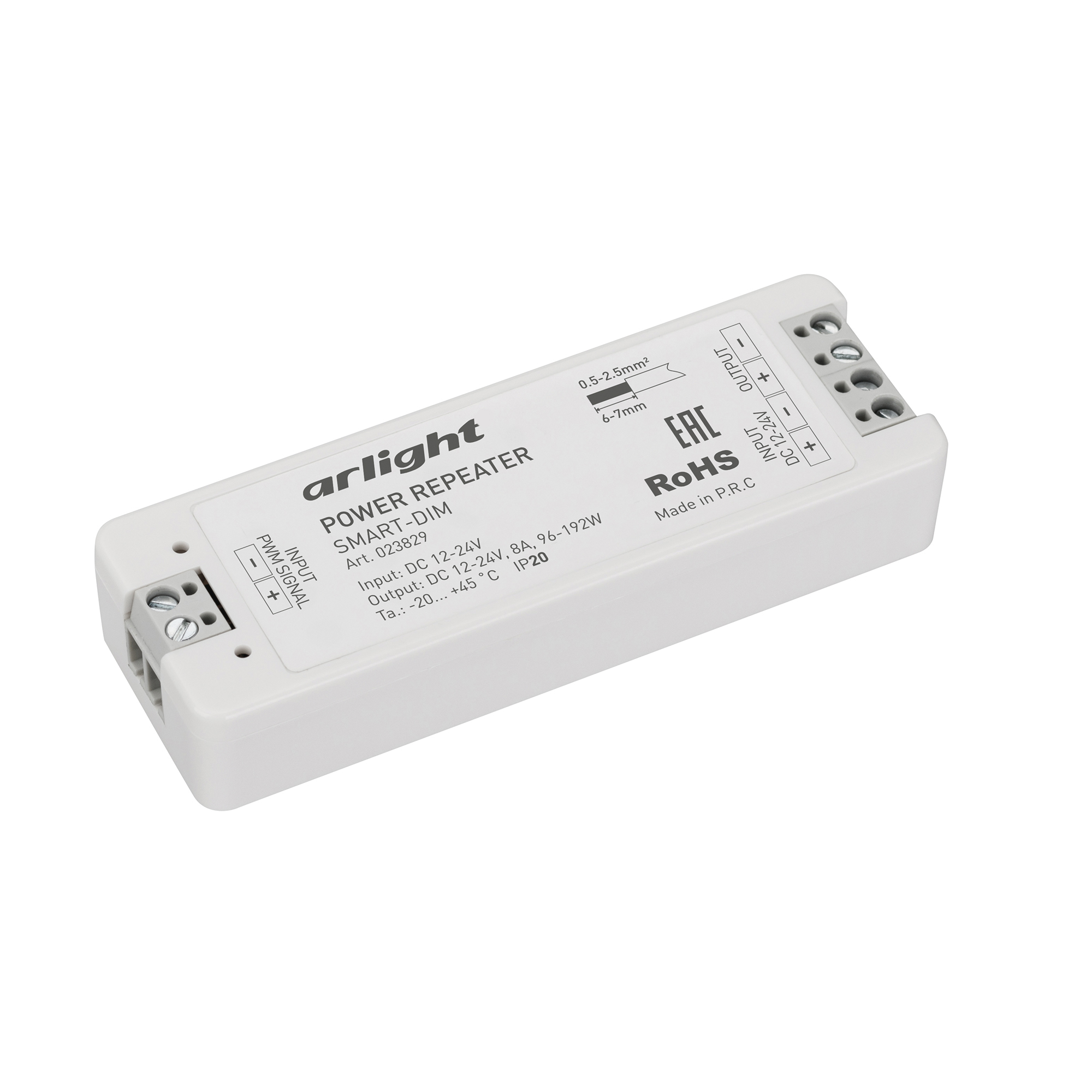 1-канальный усилитель, предназначенный для увеличения мощности и подключения большего количества одноцветных светодиодных лент. Питание изделия имеет диапазон напряжений от 12В до 24В, максимальный ток 8А на 1 канал, максимальная мощность 96-192Вт (в зависимости от напряжения питания). Усилитель имеет пластиковый корпус белого цвета. Габариты изделия составляют 97x33x18 мм.