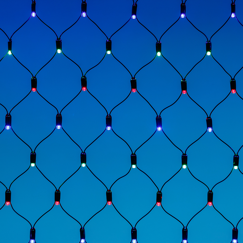 Светодиодная сеть Classic. 2500x2500 (длина 2500 мм, высота 2500 мм). Цвет свечения RGBY (светодиоды чередуются). 432 светодиода размером 7 мм со статическим и 8 динамическими эффектами свечения с резким световым рисунком (прозрачная вогнутая линза). Провод прозрачный, ПВХ. Питание 230 В, Мощность 26 Вт,защита IP65, применение в помещении и на улице под навесом Аксессуары для подключения и выбора режима свечения в комплекте.