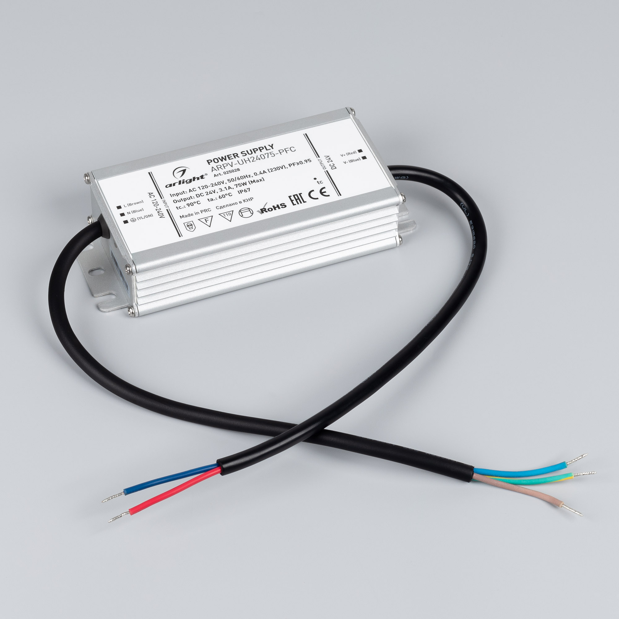 Источник напряжения с гальванической развязкой для светодиодных изделий. Входное напряжение 120-240 VAC. Выходные параметры: 24 В, 3.1 А, 75 Вт. Встроенный PFC >0,95. Герметичный алюминиевый корпус IP 67. Рабочая температура -40…+70C⁰.Габаритные размеры длина 158 мм, ширина 67.5 мм, высота 33.5 мм. (131x67.5x33.5 мм - без "ушей"). Гарантийный срок 7 лет.