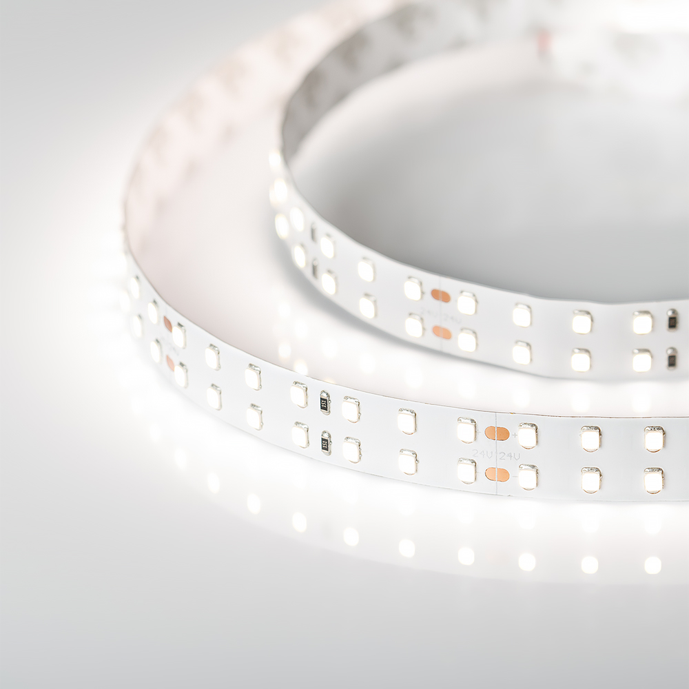 Широкая двухрядная лента LUX шириной 15 мм с очень высоким индексом цветопередачи CRI>98 и высокой световой эффективностью. Светодиоды SMD 2835 (196 шт/м) с дневным белым цветом свечения (3800–4200 К). Мощность 16.6 Вт/м, напряжение питания 24 В. Минимальный отрезок 71.43 мм (14 светодиодов). Может использоваться с любыми профилями. Встроенные линии света для основного освещения. Создание накладных и подвесных светильников из алюминиевого профиля.