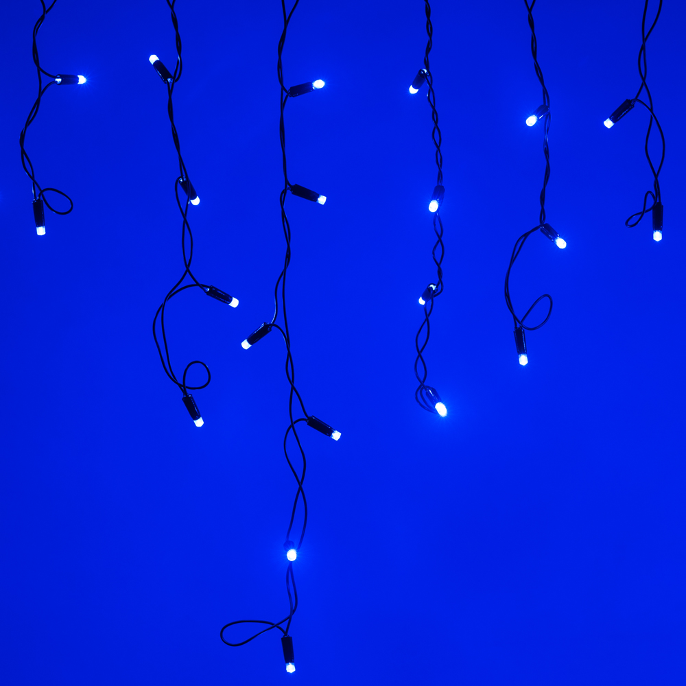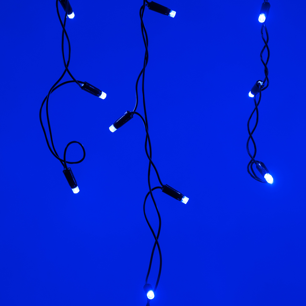 Светодиодная бахрома Classic. Размер 2400x600 мм (длина 2400 мм, по длине 24 нити высотой 200/600 мм). Количество светодиодов 88 размером 7 мм. Цвет свечения СИНИЙ, эффект постоянного свечения с резким световым рисунком (прозрачная вогнутая линза). Провод черный, ПВХ. Питание 230 В, Мощность 6 Вт, защита IP65, применение на улице под навесом. Аксессуары для подключения приобретаются отдельно.