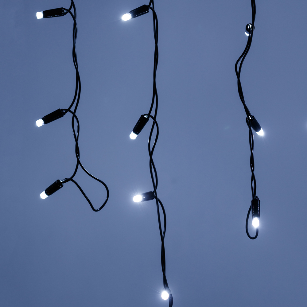 Светодиодная бахрома Pro. Размер 4000x600 мм (длина 4000 мм, по длине 32 нити высотой 200/600 мм). Количество светодиодов 128 шт размером 7 мм. Цвет свечения БЕЛЫЙ (6000 К), эффект постоянного свечения с резким световым рисунком (прозрачная вогнутая линза). Провод черный, резиновый. Питание 230 В, Мощность 8 Вт, защита IP65, применение на улице под навесом. Аксессуары для подключения приобретаются отдельно.