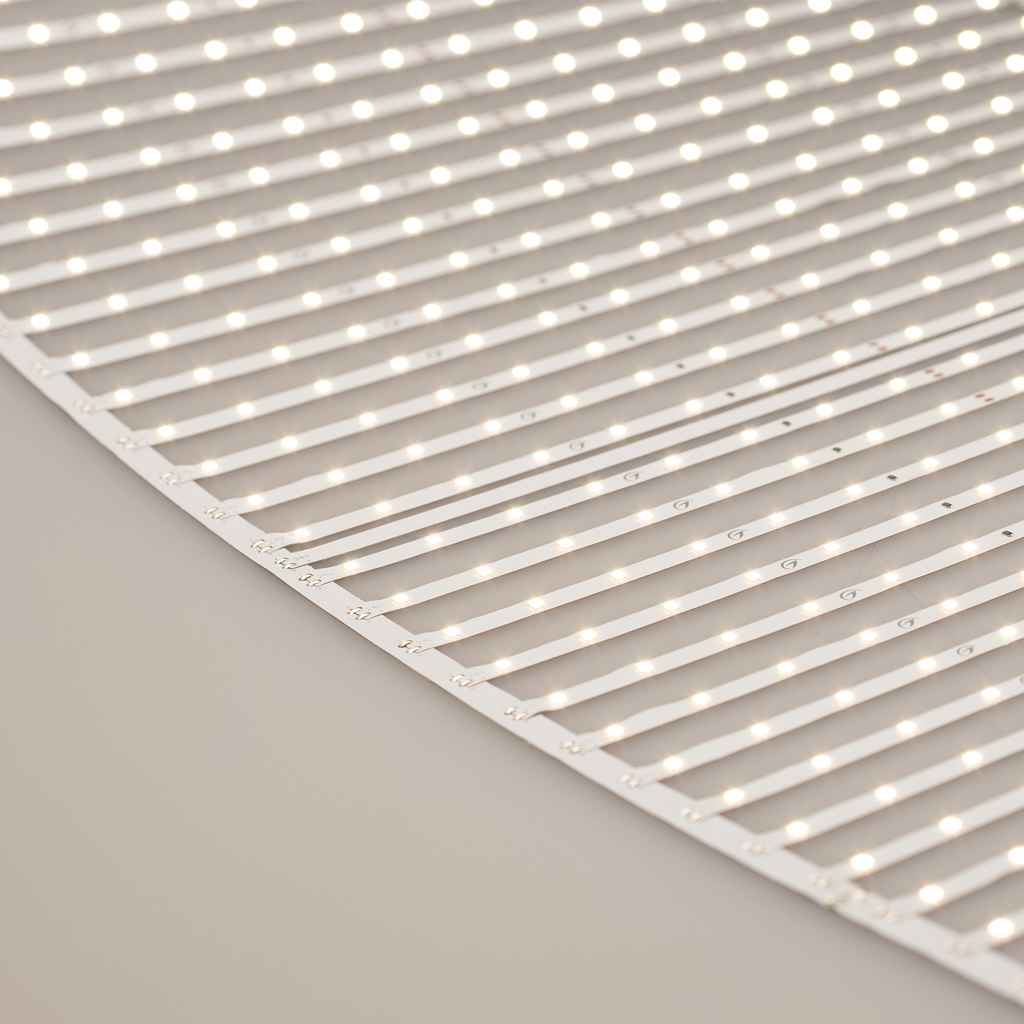 Лента-сеть из 6 сегментов по 20 линий, соединенных между собой платой. Общая длина сети 3000 мм, что позволяет делать подсветку больших поверхностей: потолков, стен, ниш, колонн. Светодиоды SMD 2835 (640 шт/м) дневного белого цвета свечения (3900–4000 К) с индексом цветопередачи CRI>85 и высокой световой эффективностью. Мощность 43.6 Вт/м, напряжение питания 24 В. Шаг резки 500 мм. Быстрый монтаж на основу-скотч 3М и простое подключение. Дополнительный теплоотвод не обязателен.