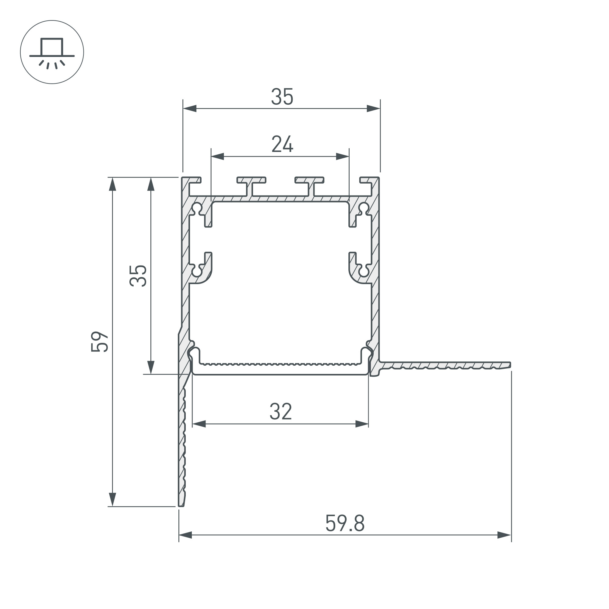 Габаритные размеры профиля составляют 2000 мм в длину, 59,8 мм в ширину и 59 мм в высоту. Площадка для установки светодиодных лент позволяет использовать ленту шириной до 24 мм и мощностью до 52,5 Вт/м. Это обеспечивает гибкость в выборе светодиодных лент и создает потрясающие световые решения.