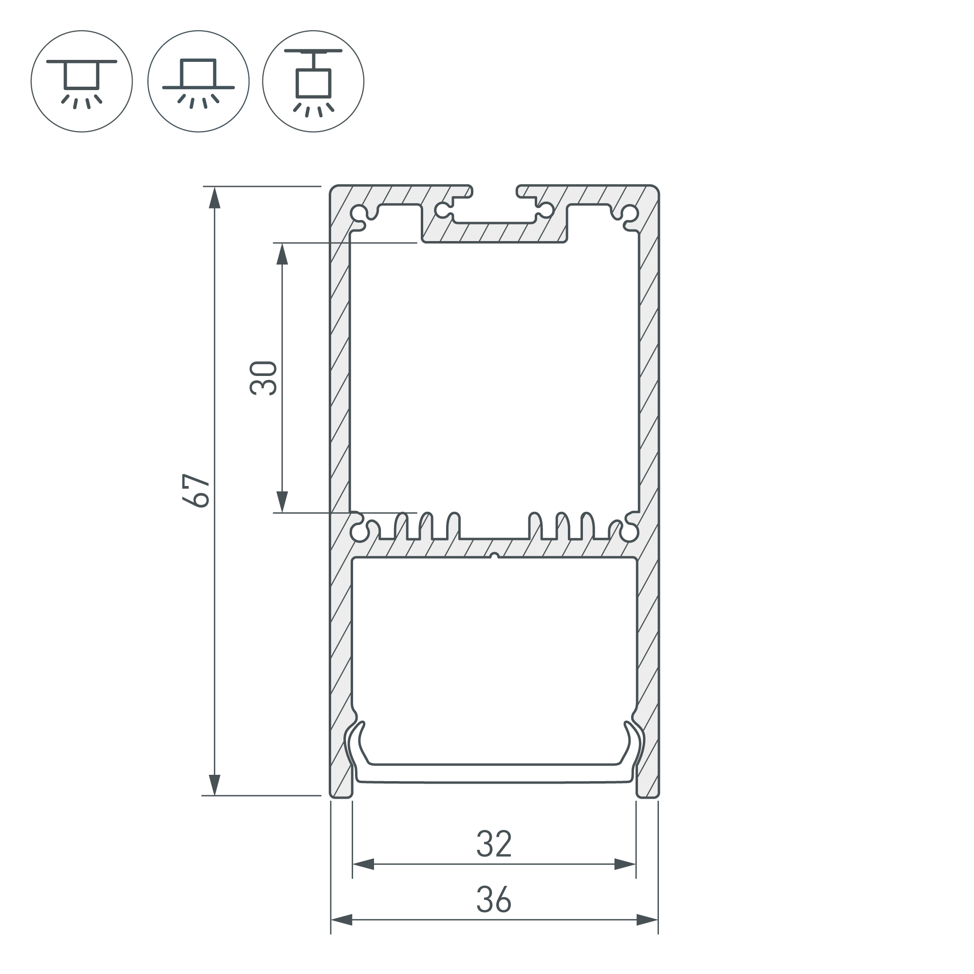 Подвесной/накладной/встраиваемый профиль черного цвета из алюминия с отсеком для блока питания (30х32 мм) в комплекте с матовым рассеивателем из поликарбоната со светопропусканием 67% и заглушками идеально подходит для основного освещения и контурной подсветки. Габаритные размеры профиля составляют 2500 мм в длину, 36 мм в ширину и 67 мм в высоту. Площадка для установки светодиодных лент позволяет использовать ленту шириной до 32 мм и мощностью до 54 Вт/м. Это обеспечивает гибкость в выборе светодиодных лент и создает потрясающие световые решения. Прочие аксессуары не включены в комплект и приобретаются отдельно. Цена указана за комплект. Отличное решение для создания современных световых проектов.