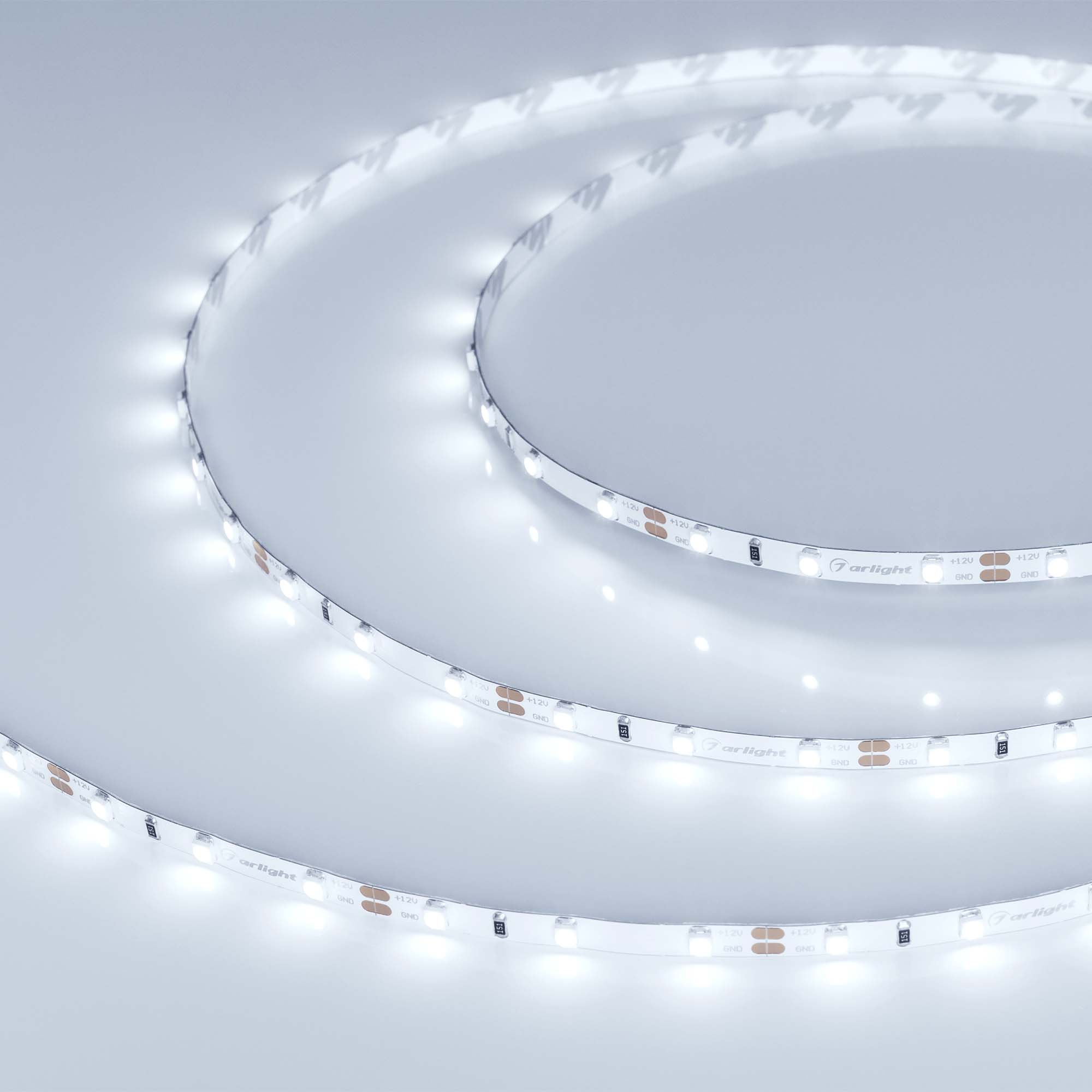 Светодиодная узкая лента RT серии A60. Светодиоды 2835, 60 шт/м, белая плата шириной 5 мм, скотч 3M. Цвет ХОЛОДНЫЙ 8000K, индекс цветопередачи CRI>85, угол 120°. Питание 12 В, мощность 4.8 Вт/м (24 Вт на 5 м). Размеры 5000х5х1.5 мм. Мин. отрезок 50 мм, 3 светодиода. Цена за 1 м.