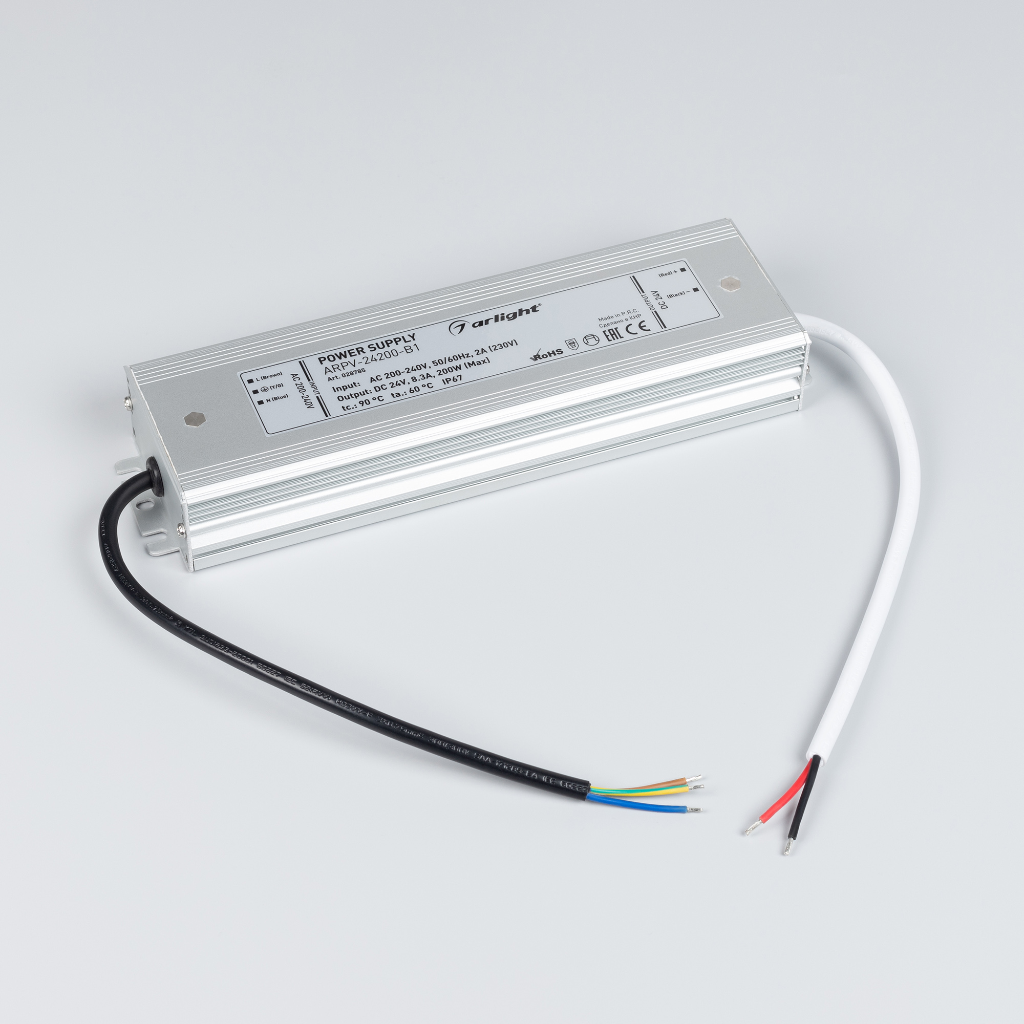 Источник напряжения с гальванической развязкой для светодиодных изделий. Входное напряжение 200-240 VAC. Выходные параметры: 24 В, 8.3 А, 200 Вт. Встроенный PFC >0.5. Герметичный алюминиевый корпус IP 67. Рабочая температура -30…+50C⁰. Габаритные размеры длина 235 мм, ширина 67 мм, высота 34 мм. Совместим с диммерами с частотой ШИМ более 5кГц. Гарантийный срок 3 года.