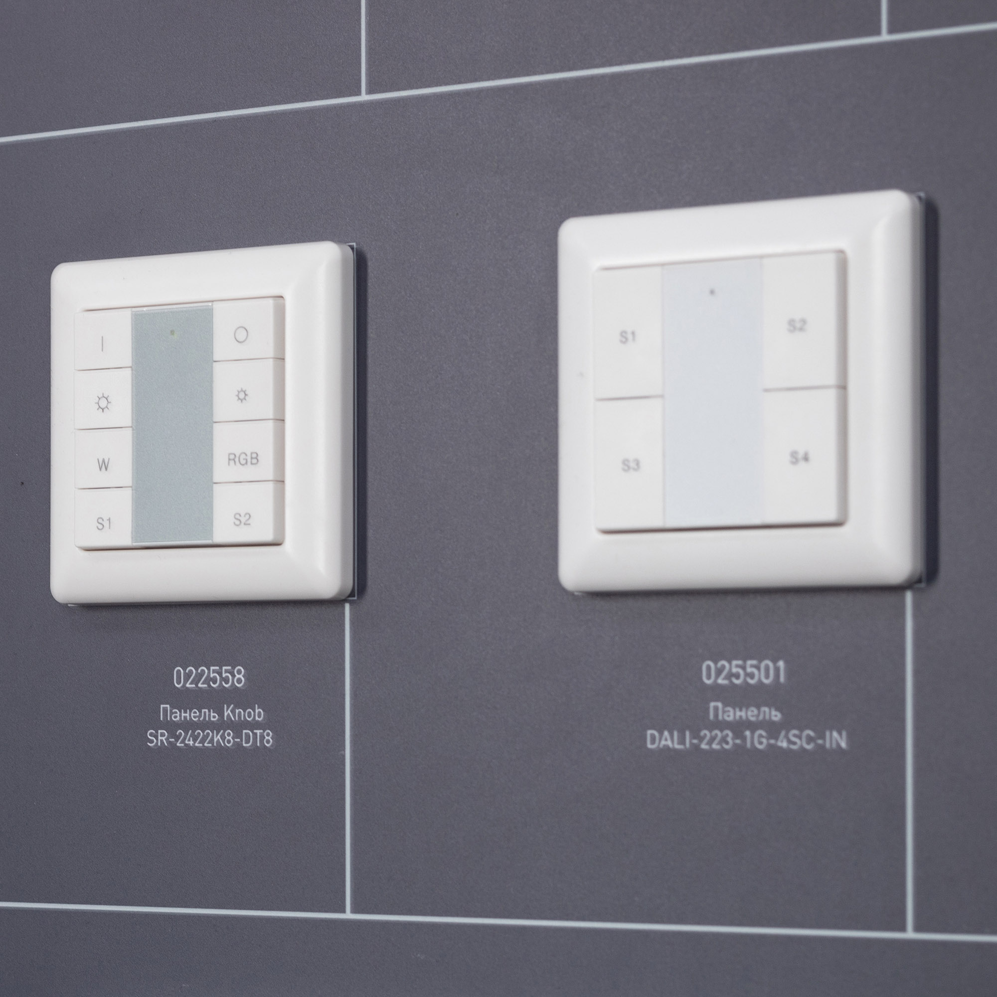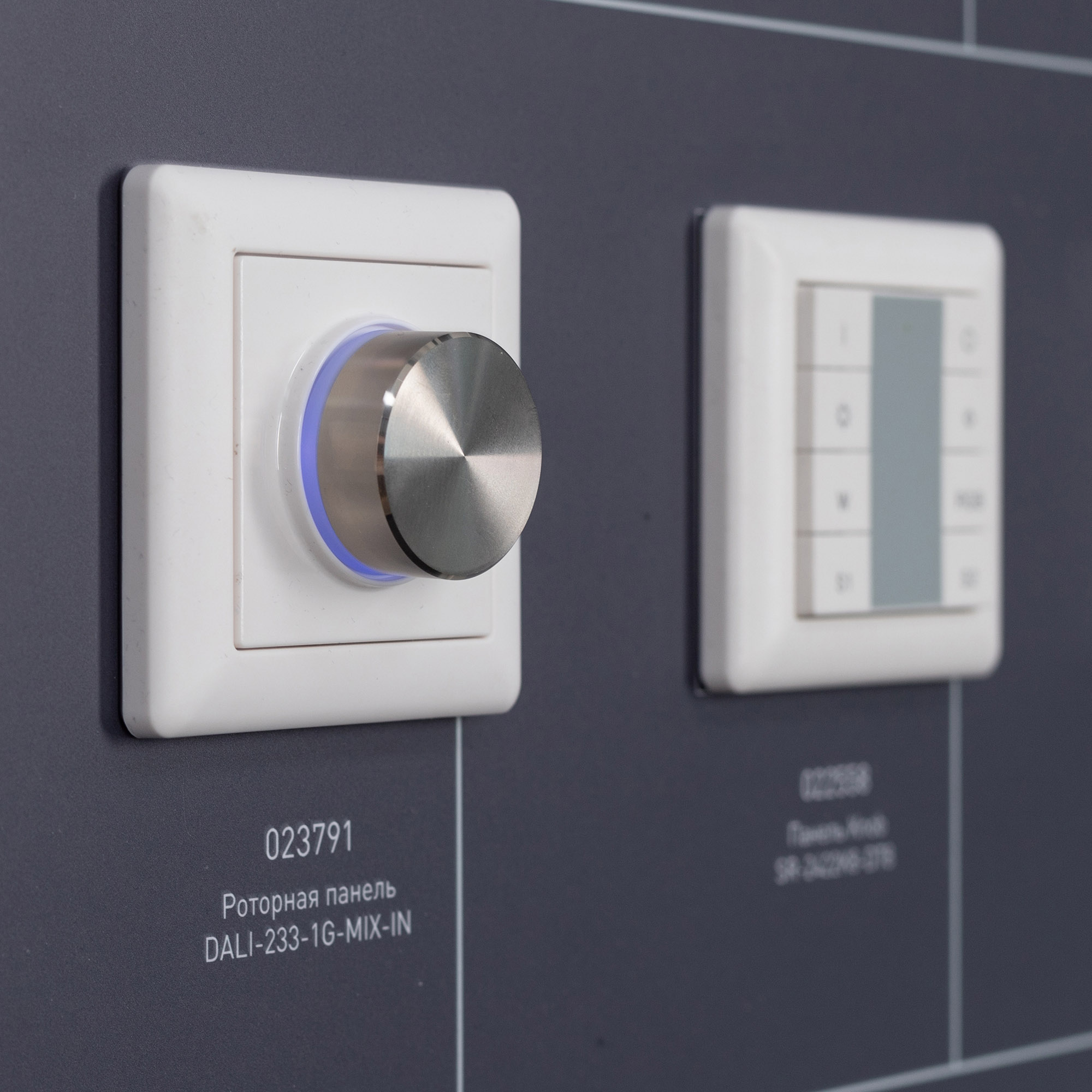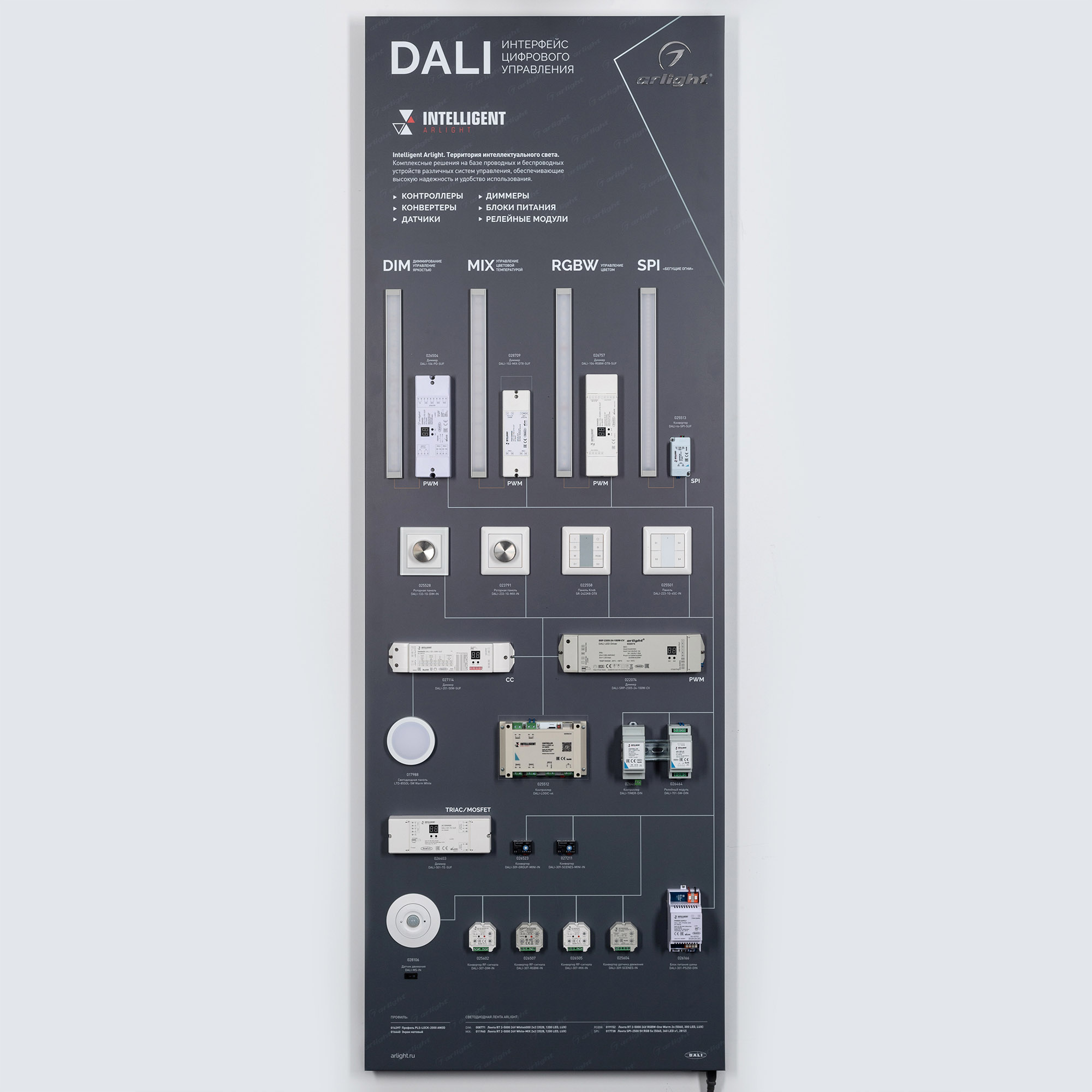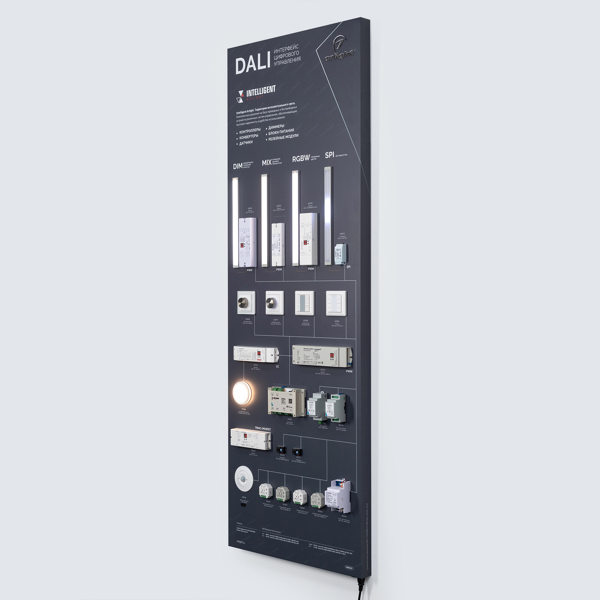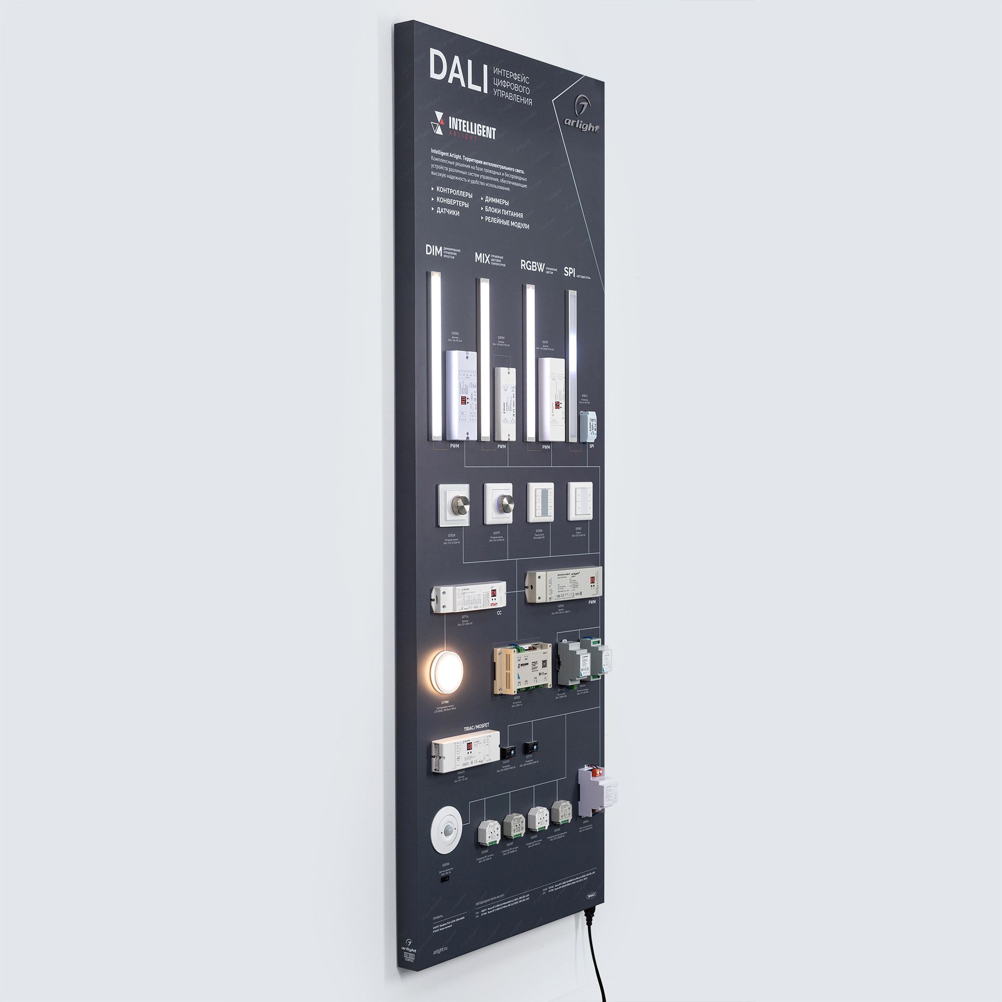 На стенде представлены основные типы устройств для управления освещением по протоколу DALI, возможности интеграции с прочими аналоговыми и цифровыми протоколами / системами управления.