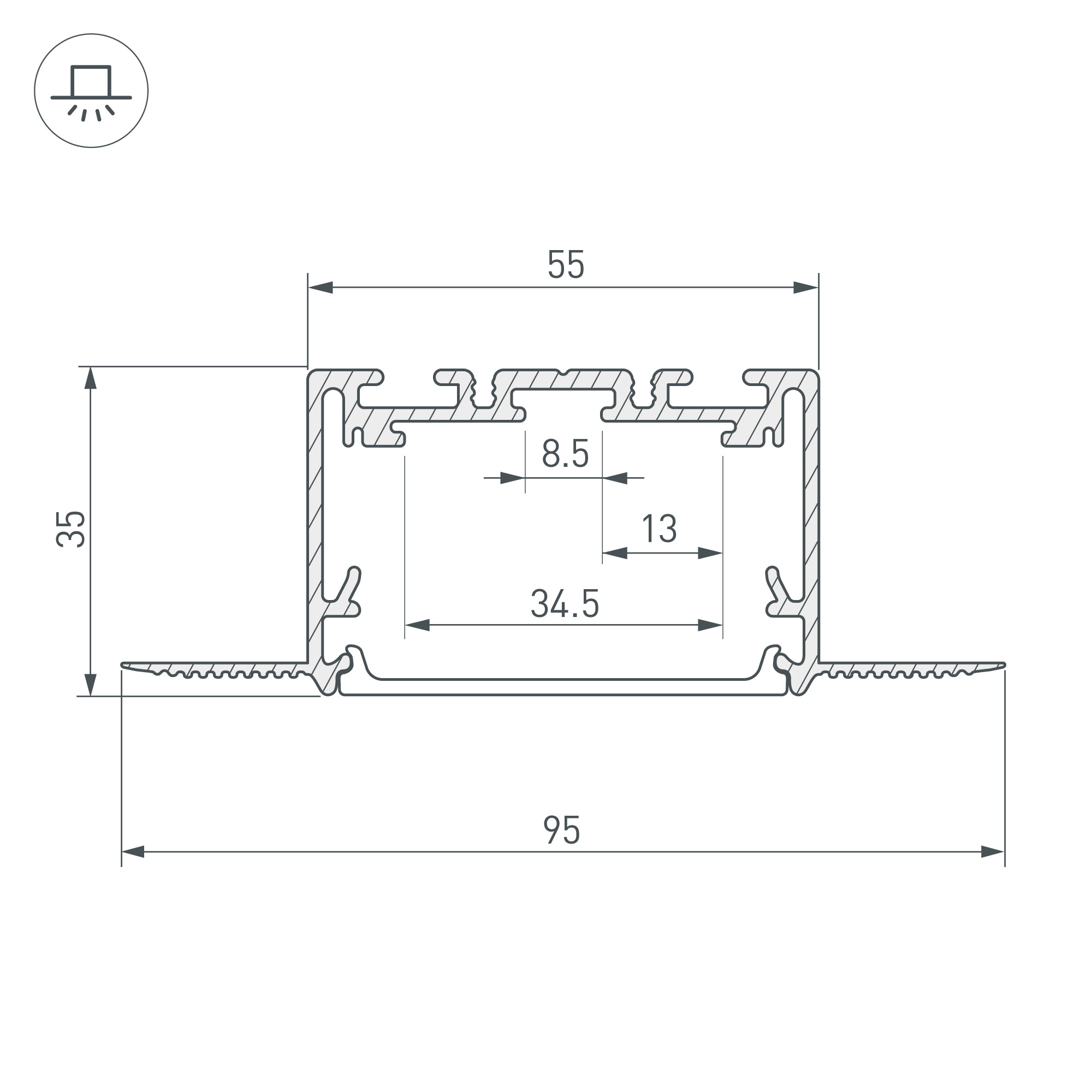 Встраиваемый профиль со скрытым фланцем под строительную отделку из анодированного алюминия для основной и контурной подсветки помещений. Используется с гибким экраном SL-SEAMLESS. Габаритные размеры профиля составляют 2500 мм в длину, 95 мм в ширину и 35 мм в высоту, паз для установки 55 мм. Площадка для установки светодиодных лент позволяет использовать ленту шириной до 34,5 мм и мощностью до 59,1 Вт/м. Это обеспечивает гибкость в выборе светодиодных лент и создает потрясающие световые решения.