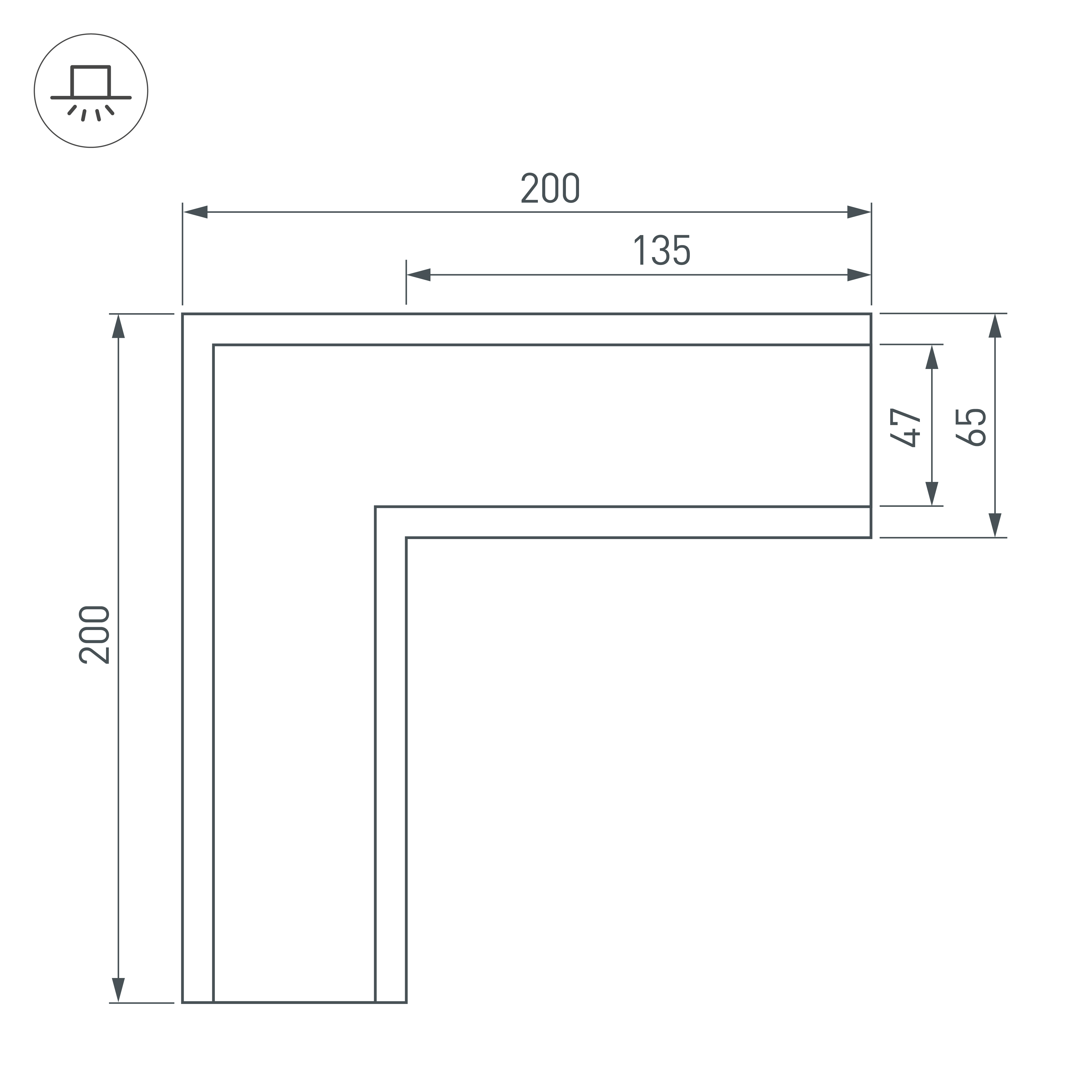 Прямой угол в сборе с накладным фланцем для соединения двух профилей SL-LINIA65-F под прямым углом 90° в одной плоскости в комплекте с матовым экраном и соединителями. Экран образует линию на плоскости. Применятся при изготовлении светильников сложной геометрии.