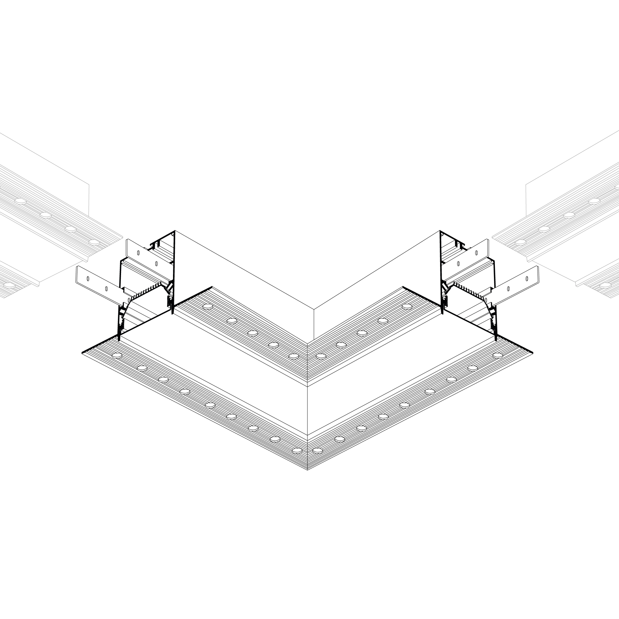 Прямой угол в сборе со скрытым фланцем под строительную отделку для соединения двух профилей SL-LINIA55-FANTOM под прямым углом 90° в одной плоскости в комплекте с матовым экраном и соединителями. Экран образует линию на плоскости. Применятся при изготовлении светильников сложной геометрии. Длина внешней стороны угла 200мм. Цена за комплект.