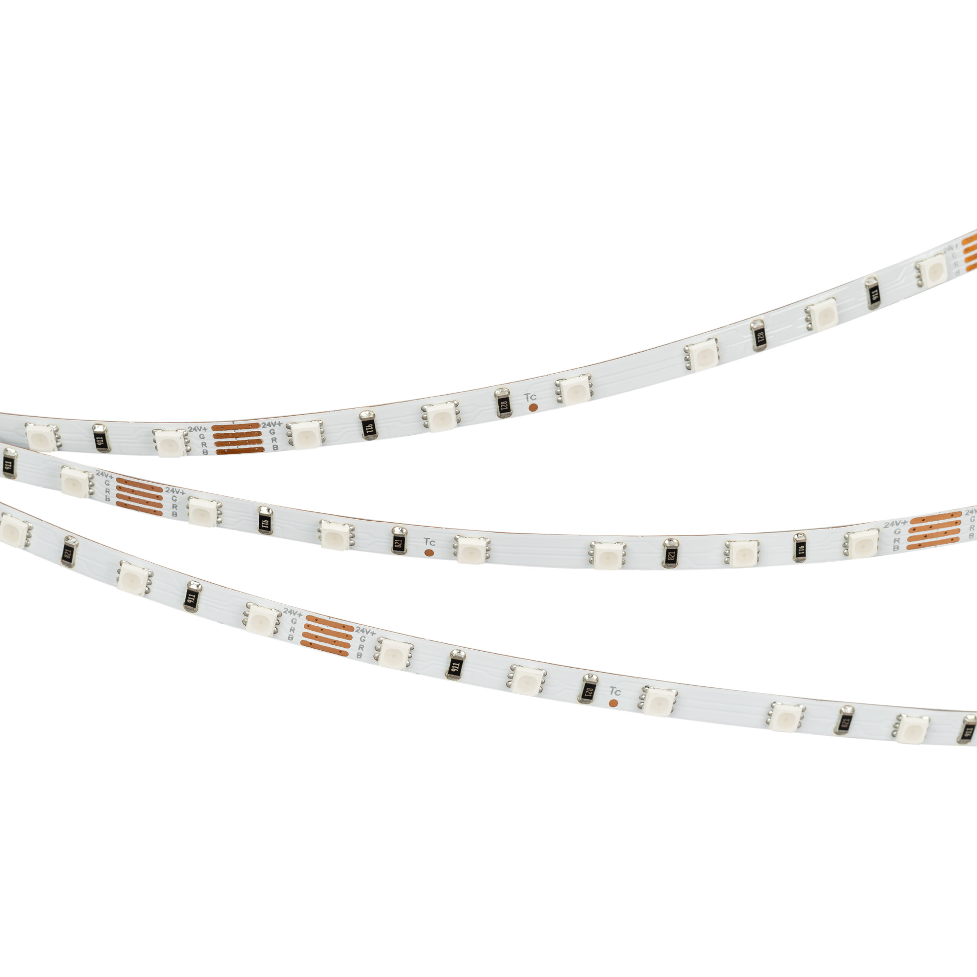 Мультицветная светодиодная лента RT серии G60 шириной 5 мм, мощностью 6.6 Вт/м. цвет свечения RGB. Напряжение питания 24 В. Светодиоды SMD 3838 (60 шт/м). Минимальный отрезок 100 мм (6 светодиодов). Трехканальная лента с 4 проводами для подключения, управляется RGB-контроллером. Применяется для создания яркой цветной декоративной подсветки элементов интерьера, ниш, рекламных конструкций, витрин, зон отдыха.