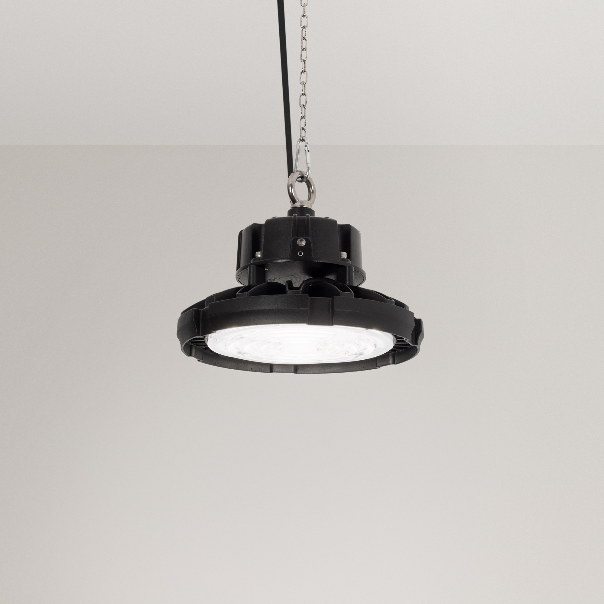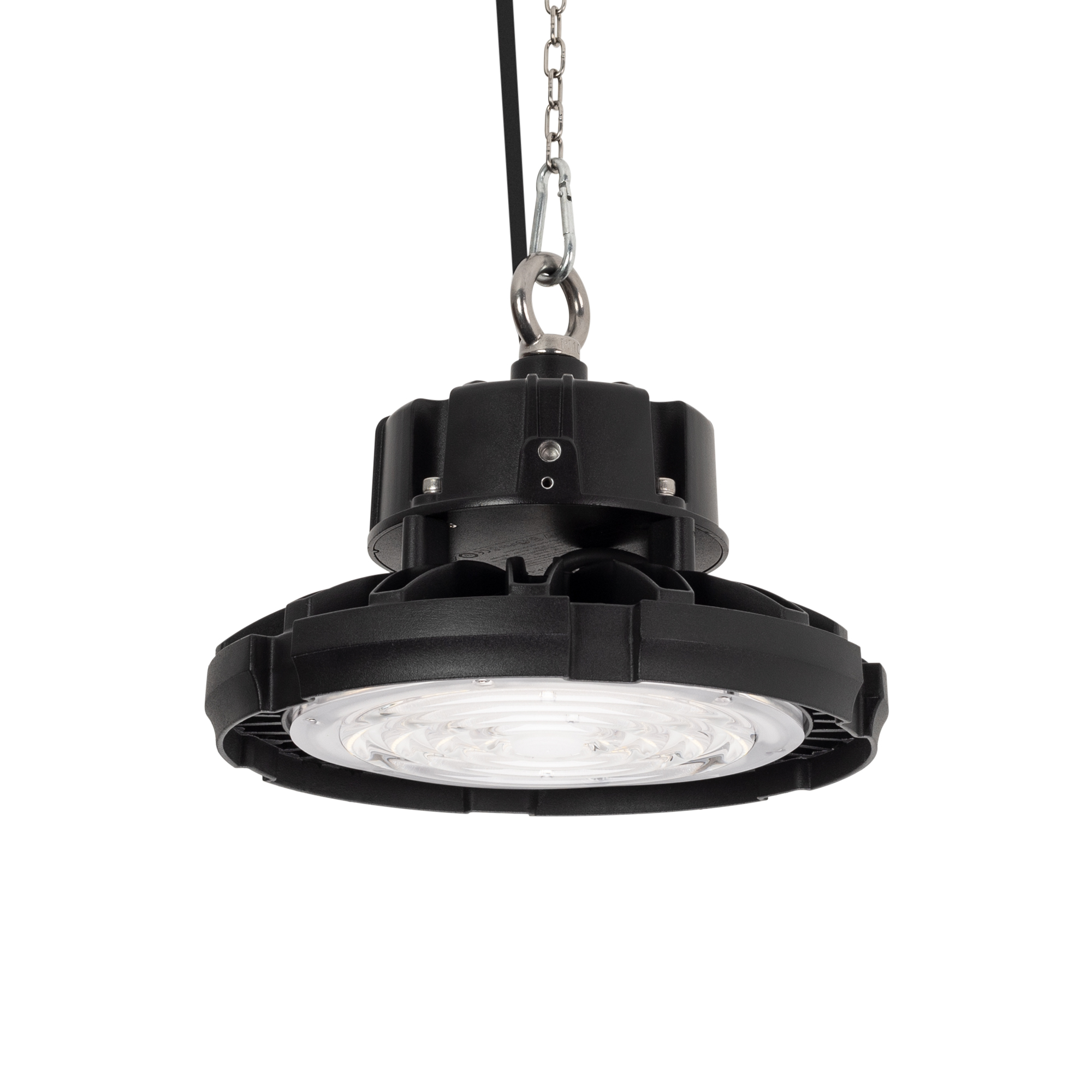 Светильник SP-FENIX-R245-100W White5000 (BK, 60 deg, 230V) мощностью 100 Вт для освещения складских, производственных, промышленных, торговых, спортивных и других помещений с высокими потолками. Дневной белый цвет свечения (5000 K), световой поток 14000 лм и угол излучения 60° для организации общего освещения. Светильник может стать эффективной заменой светильников с лампами МГЛ, ДРЛ, ДНаТ. Высокая степень пылевлагозащиты IP65 допускает использование в помещениях с перепадами температуры и влажности. Светильник имеет два способа крепления: подвесной и установка на фиксирующей скобе. Рым-болт поставляется в комплекте. Под заказ возможна поставка модификаций с управлением по аналоговому протоколу 0–10 В.