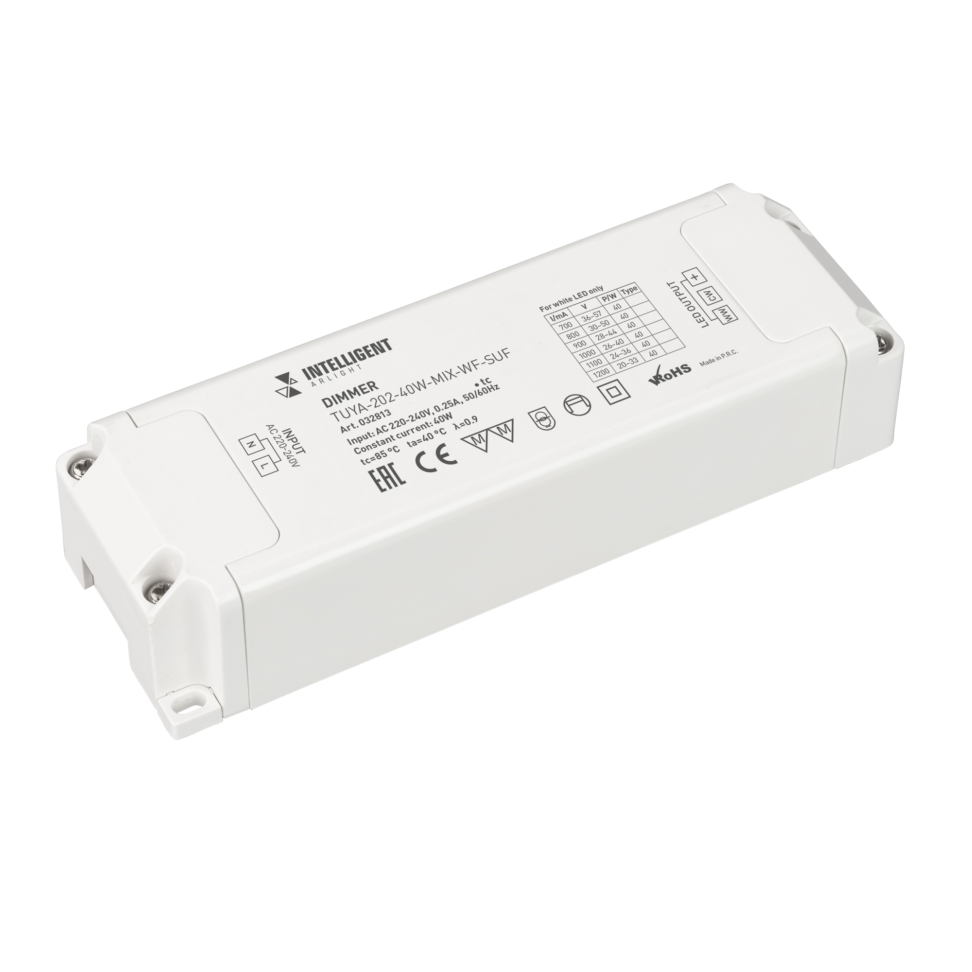 Диммер двухканальный, для светодиодных MIX (CCT, Tunable White) светильников. Выбор значения выходного тока осуществляется подстроечным резистором на плате. Вход 220-240V AC, PF>0.95 выход 700-1200mA@20-57V DC (в зависимости от вых. тока), мощность 40W. Низкий пусковой ток <5А@100mks. Защита от КЗ на выходе, перегрузки, перегрева. Управление через WI-FI 2.4ГГц, совместим с платформой TUYA, и АЛИСА от ЯНДЕКС. Поддерживается управление со смартфона через приложение INTELLIGENT ARLIGHT, доступного для ANDROID и IOS устройств в соответствующих сторах. Размеры 160х50х29 мм.