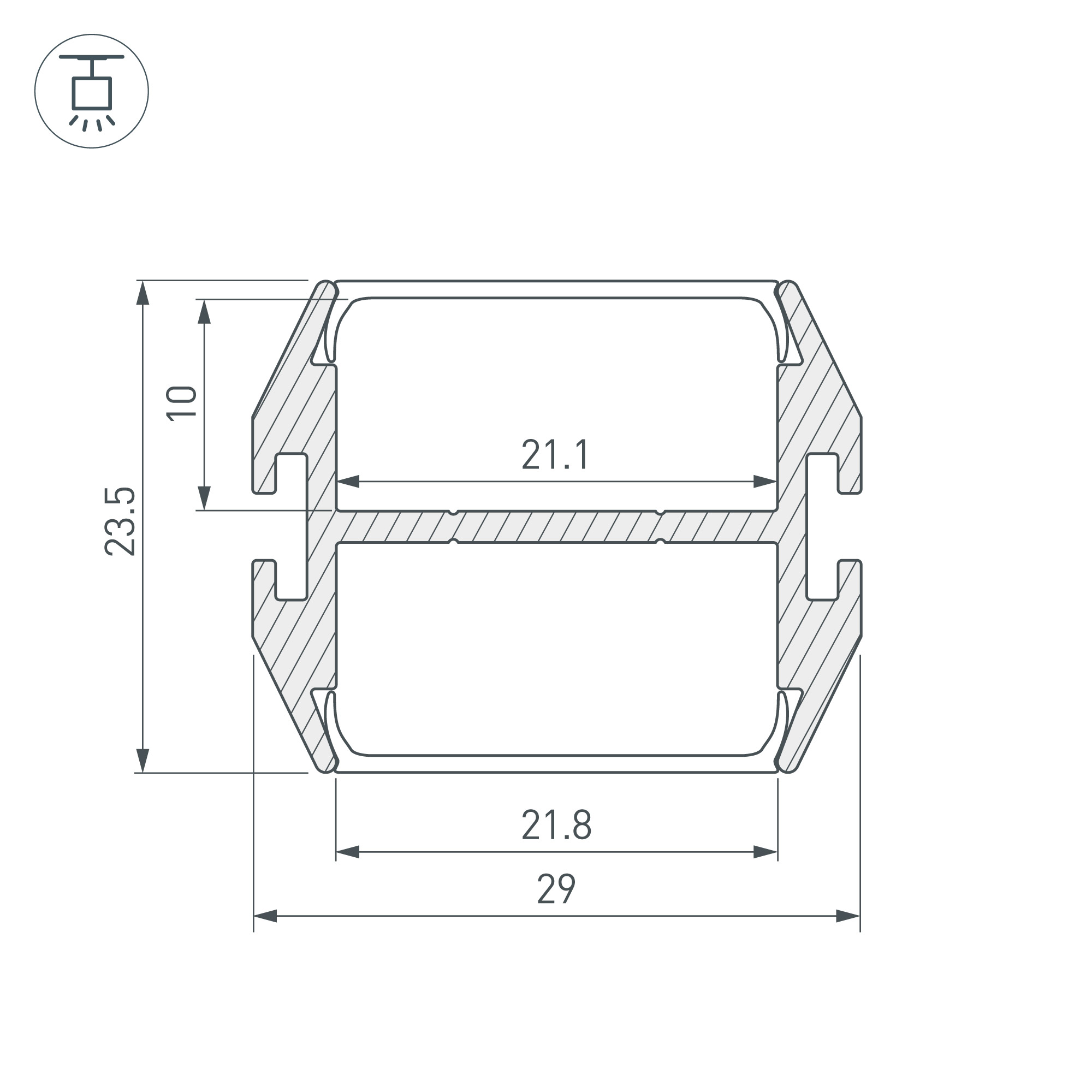 Габаритные размеры профиля составляют 2000 мм в длину, 29 мм в ширину и 23,5 мм в высоту. Площадки для установки светодиодных лент позволяют использовать ленты шириной до 22 мм и мощностью до 12 Вт/м каждая. Это обеспечивает гибкость в выборе светодиодных лент и создает потрясающие световые решения.