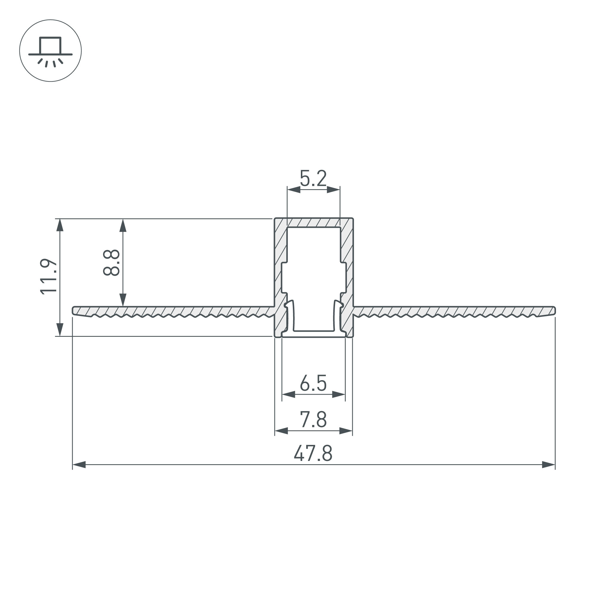 Встраиваемый профиль со скрытым фланцем из анодированного алюминия под строительную отделку для контурной подсветки интерьера. Габаритные размеры профиля составляют 2000 мм в длину, 47,8 мм в ширину и 12 мм в высоту. Площадка для установки светодиодных лент позволяет использовать ленту шириной до 5,2 мм и мощностью до 26,46 Вт/м. Это обеспечивает гибкость в выборе светодиодных лент и создает потрясающие световые решения.