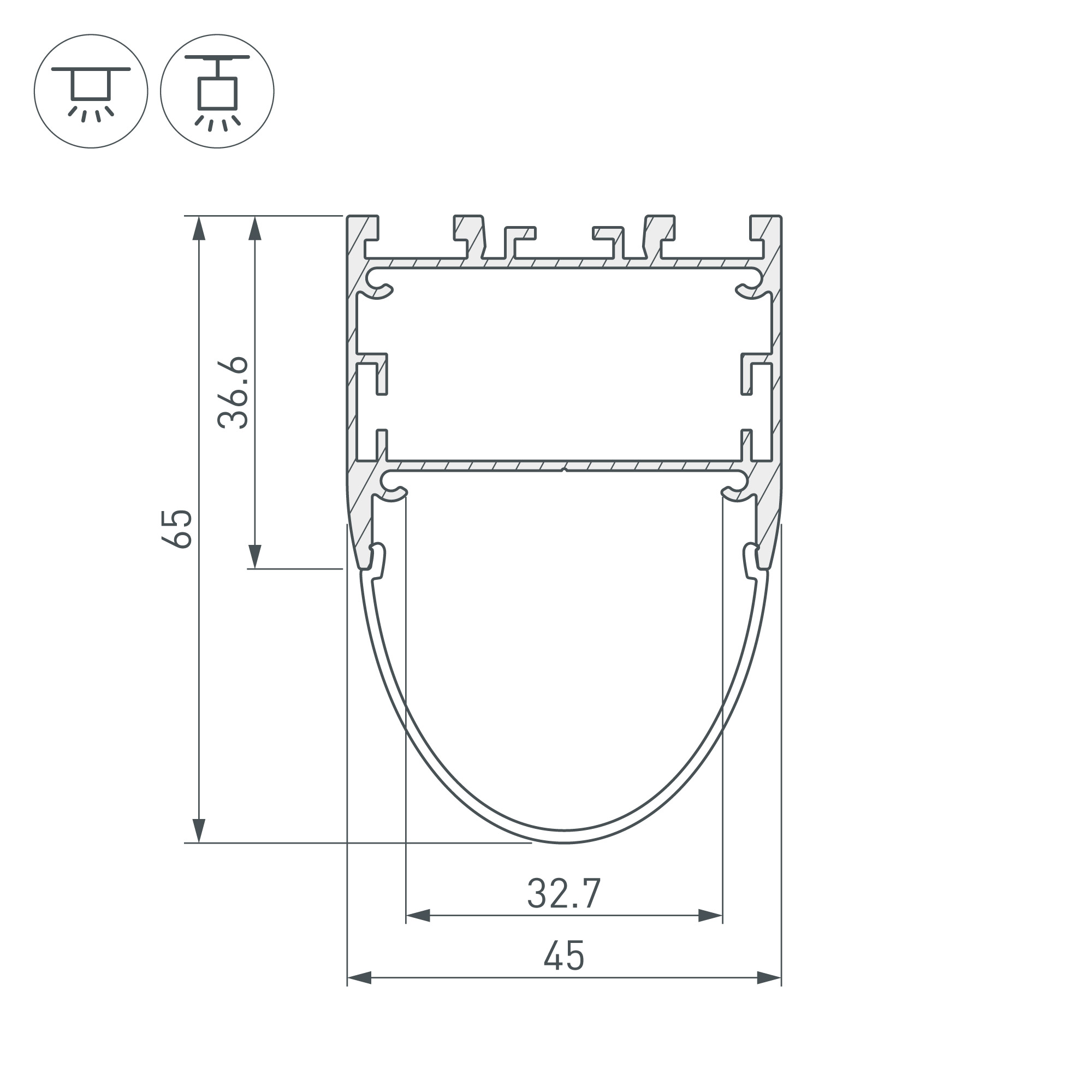Накладной/подвесной профиль из анодированного алюминия с отсеком для блока питания (36х19 мм) для контурной подсветки помещений. Габаритные размеры профиля с объемным экраном составляют 2000 мм в длину, 45 мм в ширину и 65 мм в высоту. Площадка для установки светодиодных лент позволяет использовать ленту шириной до 32,7 мм и мощностью до 42 Вт/м. Это обеспечивает гибкость в выборе светодиодных лент и создает потрясающие световые решения. Экран, заглушки и другие аксессуары не включены в комплект и приобретаются отдельно. Цена указана за 1 метр профиля. Отличное решение для создания современных световых проектов.
