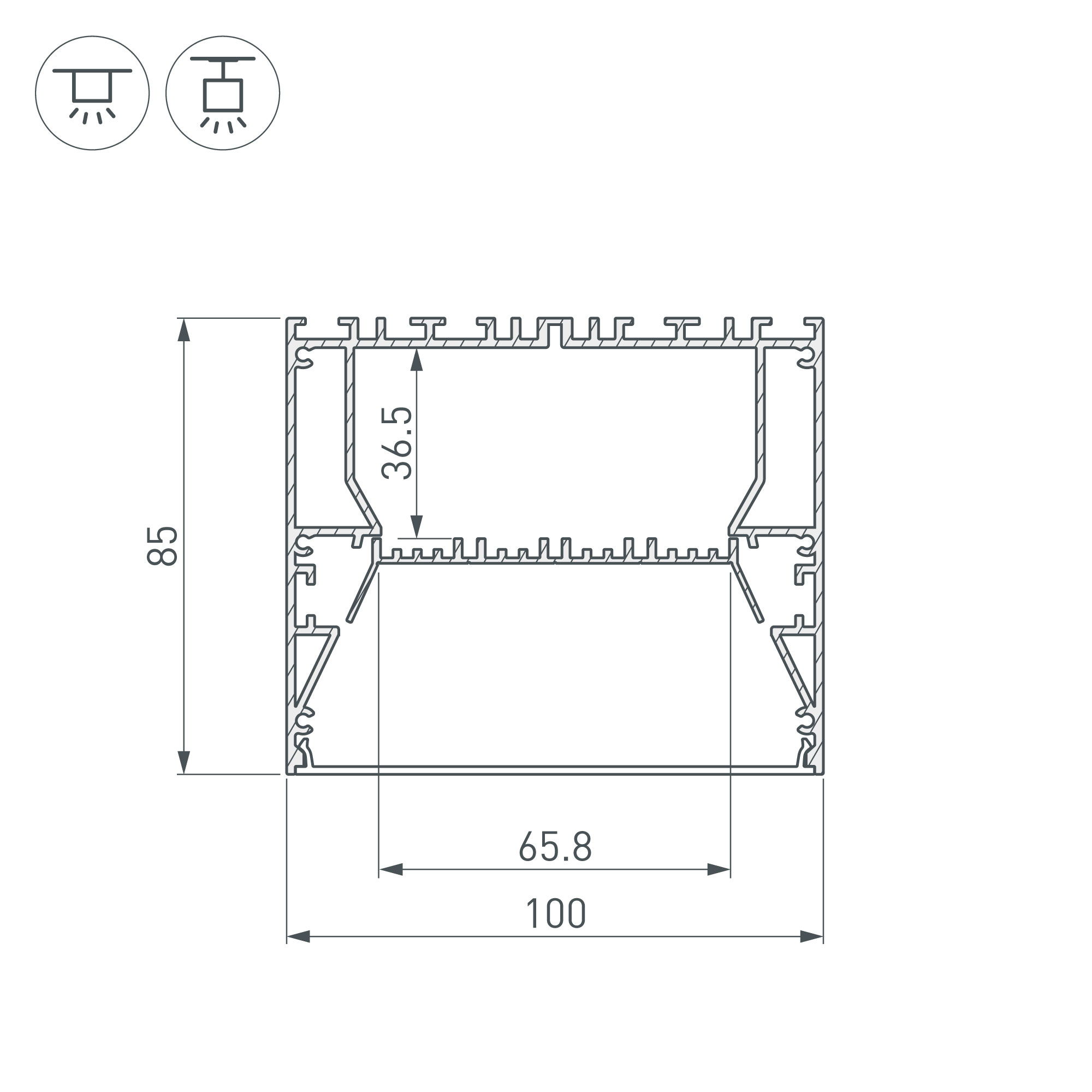 Накладной/подвесной профиль из анодированного алюминия для основного освещения и контурной подсветки. Отсек для блока питания (64х33 мм) и съемная площадка для светодиодной ленты значительно облегчают сервисное обслуживание осветительного оборудования. Габаритные размеры профиля составляют 2000 мм в длину, 100 мм в ширину и 85 мм в высоту. Площадка для установки светодиодных лент позволяет использовать ленту шириной до 65,8 мм и мощностью до 46 Вт/м. Это обеспечивает гибкость в выборе светодиодных лент и создает потрясающие световые решения. Экран, заглушки и другие аксессуары (в том числе фиксаторы для соединения профиля с площадкой для ленты) не включены в комплект и приобретаются отдельно. Цена указана за 1 метр профиля. Отличное решение для создания современных световых проектов.