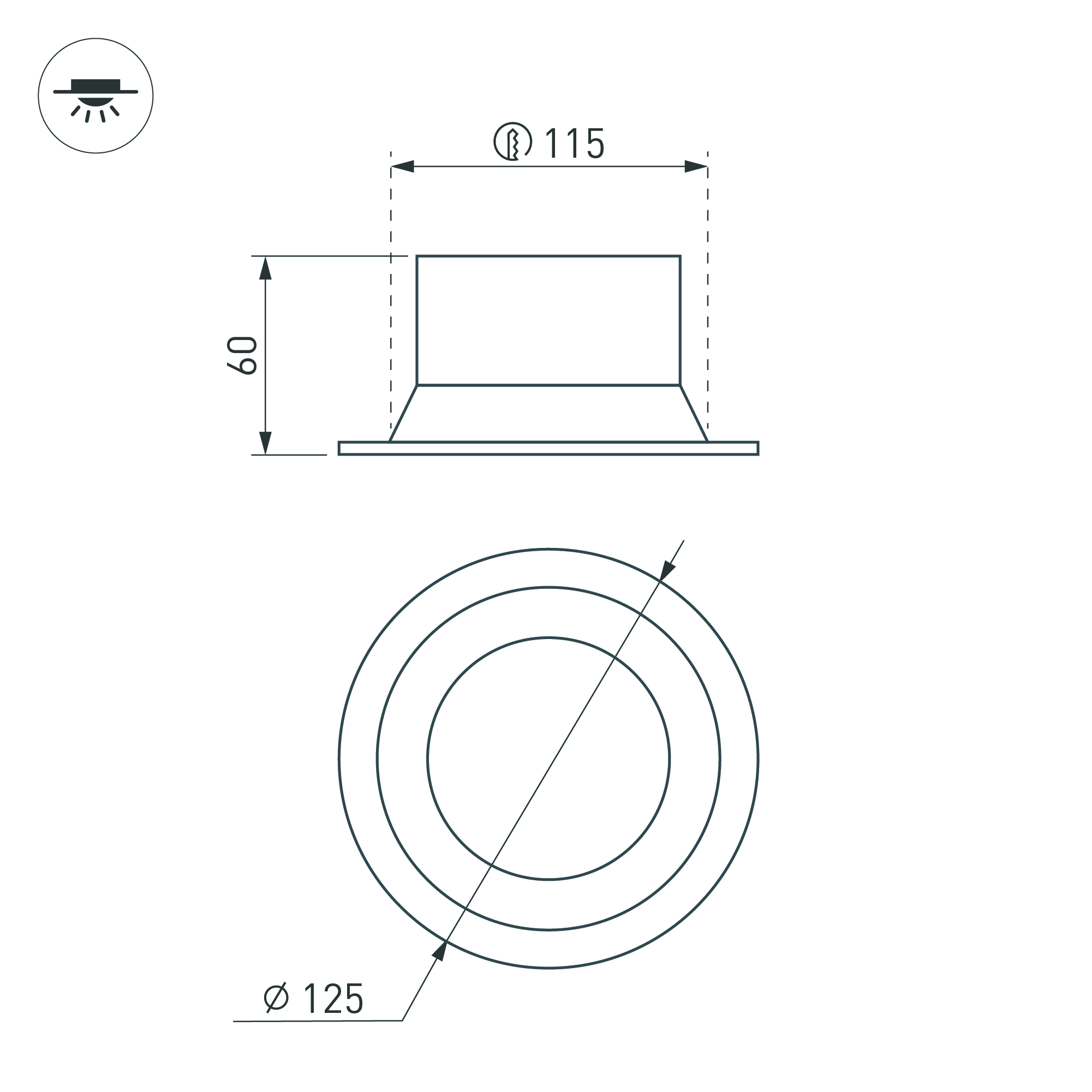 Встраиваемый светильник даунлайт. Мощность 16 Вт, св. поток 882 лм, 61 лм/Вт, тёплый 3000 K, CRI>90, угол 85°, напряжение питания 230 В. Чёрный круглый корпус из алюминия, степень защиты IP20. Размер: диаметр 125 мм, высота 60 мм. Монтаж встраиваемый, установочное отверстие: диаметр 115 мм. Драйвер 27-42 В, 400 мА, пульсация <2%.