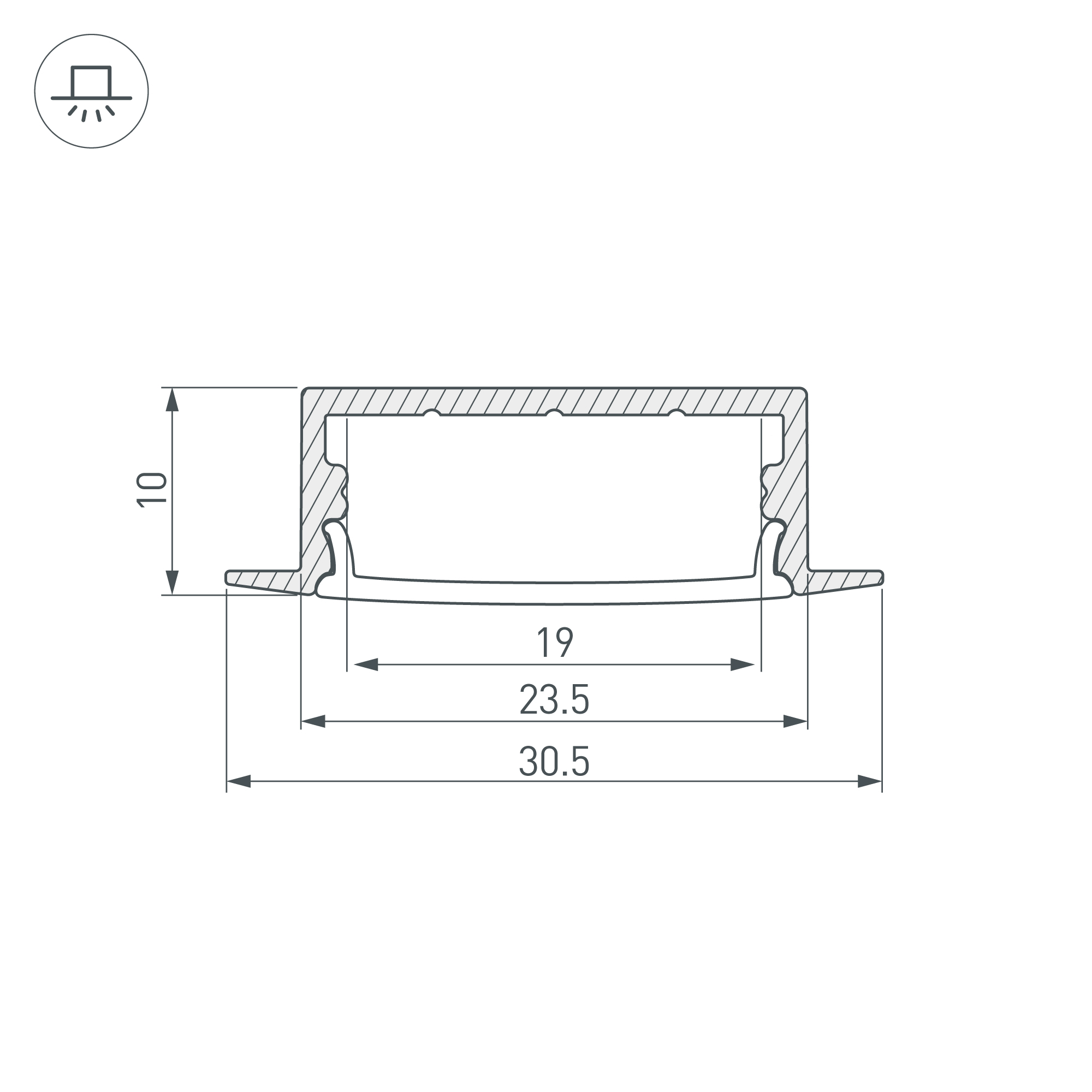 Встраиваемый профиль из анодированного алюминия с накладным фланцем для контурной подсветки элементов интерьера. Комплект с экраном и заглушками. Габаритные размеры профиля составляют 2000 мм в длину, 30,5 мм в ширину и 10 мм в высоту. Площадка для установки светодиодных лент позволяет использовать ленту шириной до 18 мм и мощностью до 21,2 Вт/м. Это обеспечивает гибкость в выборе светодиодных лент и создает потрясающие световые решения.