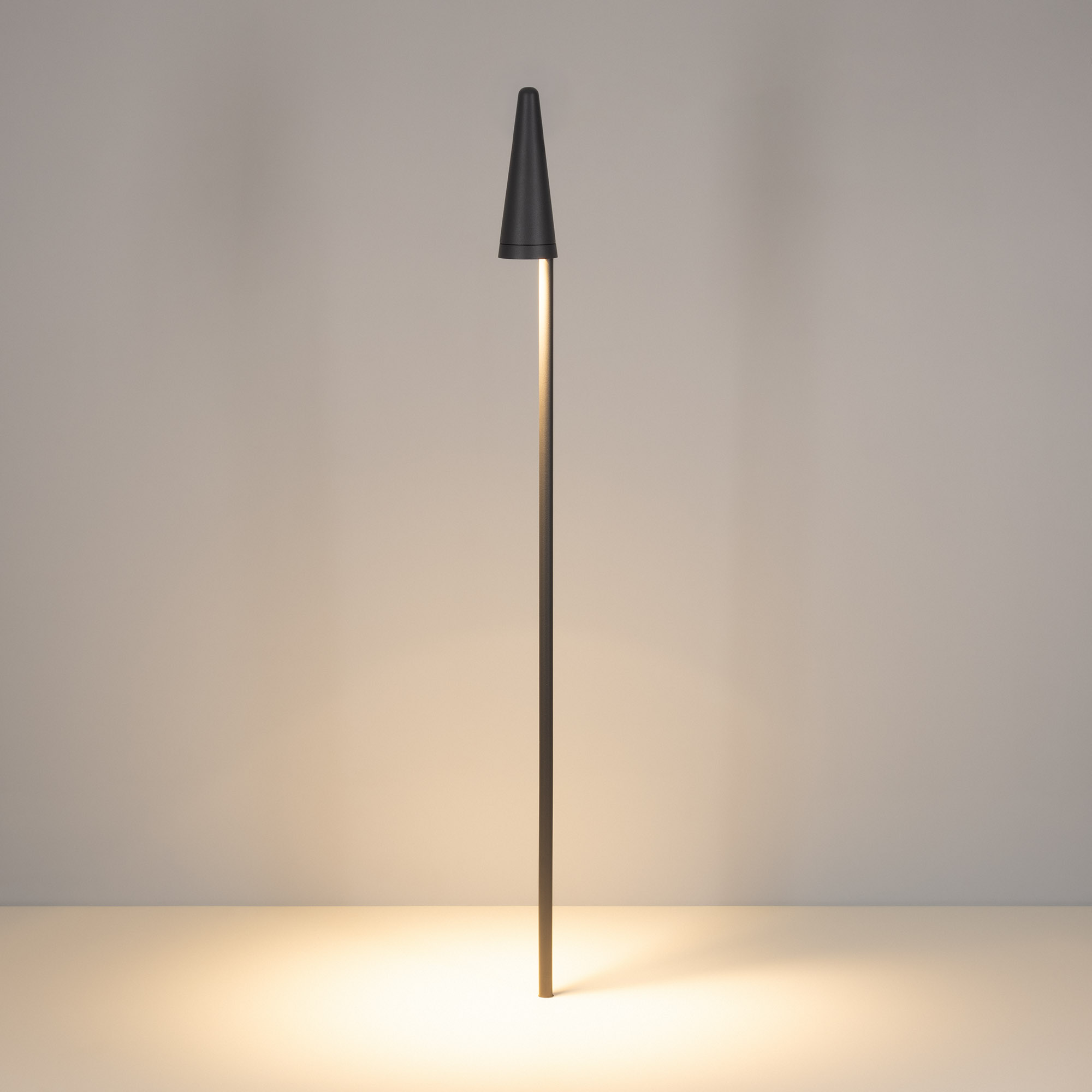 Уличный светодиодный светильник серии LGD-CONO-BOLL с теплым белым цветом свечения (3000 К) предназначен для применения в ландшафтном освещении. За счет узкого угла излучения 36° и светового потока 680 лм светильник идеально подойдет для подсветки дорожек. Мощность модели составляет 7 Вт. Корпус светильника выполнен из высококачественного алюминия, покрытого полиэфирной темно-серой порошковой краской и имеет высокую степень защиты от проникновения пыли и влаги (IP65). Оптическая часть в форме конуса располагается на стержне высотой 1500 мм и закрыта ударопрочным стеклом, обеспечивающим высокую степень защиты от внешних воздействий. Направленное свечение вниз создает акцентную засветку и отсутствие ослепляющего эффекта. Пульсация менее 2% гарантирует равномерное свечение без мерцаний. Встроенный драйвер позволяет безопасно и быстро подключить светильник напрямую к сети 230В во время монтажа в грунт.