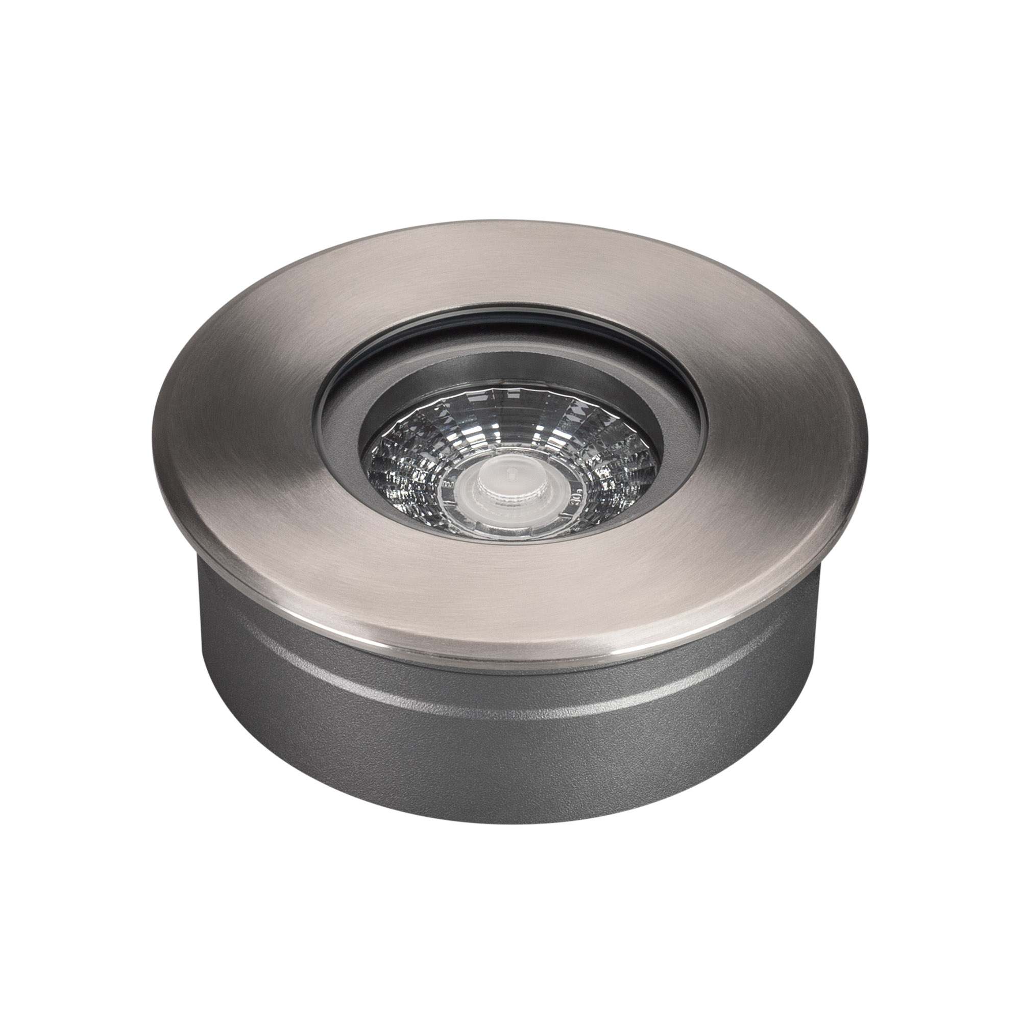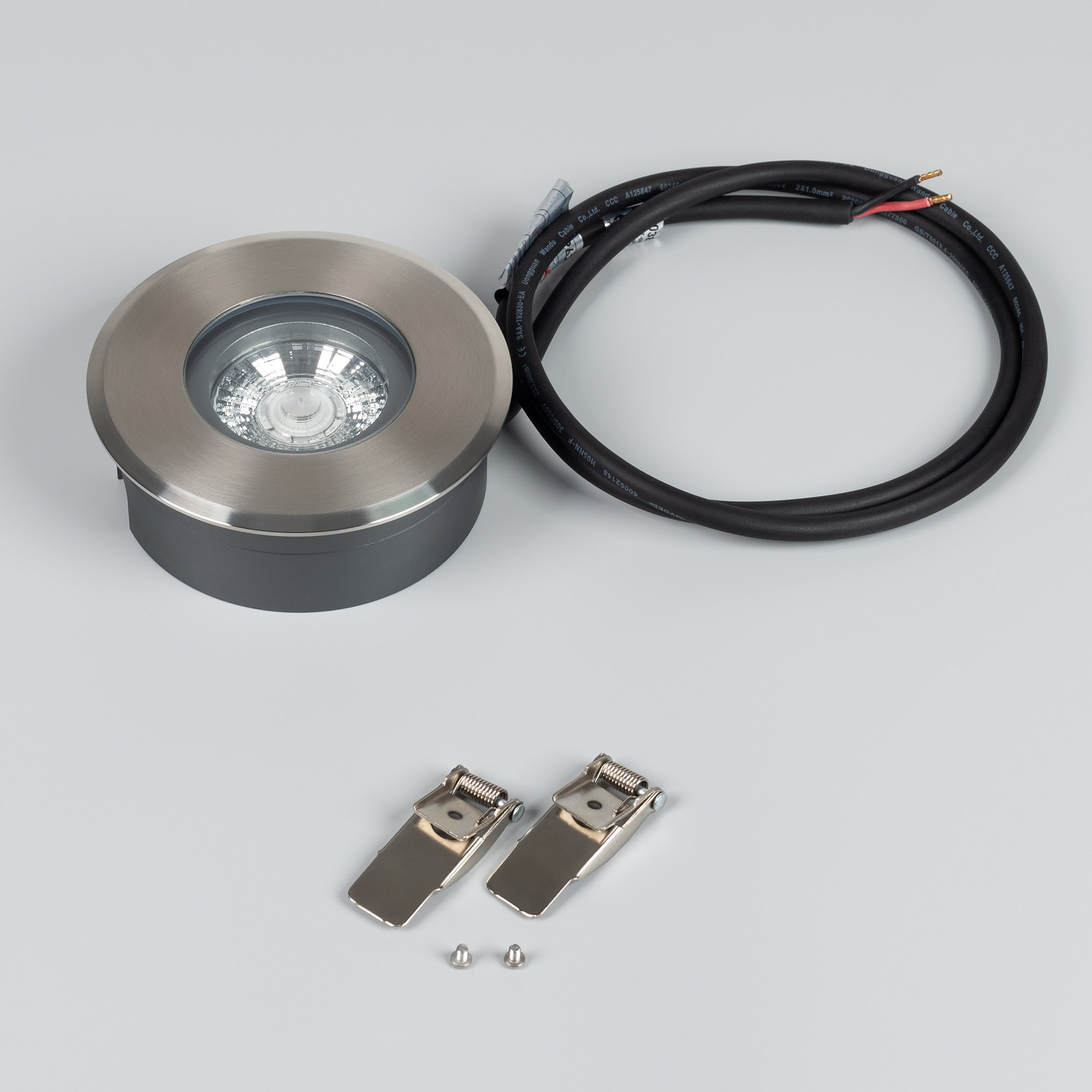 Встраиваемый светодиодный светильник ART-GROUND-SLIM мощностью 6 Вт, теплого цвета свечения (3000К), со световым потоком 400 лм предназначен для ландшафтного освещения парковых и садовых дорожек, придомовых территорий, а также декоративной подсветки стен, лестниц. Узкий угол излучения 35° позволяет создать четкий акцент на подсвечиваемом объекте. Ударопрочный круглый, компактный по высоте корпус из нержавеющей стали и алюминиевого сплава Ø110x38 мм и экран из закаленного стекла толщиной 8 мм надежно защищают оптический блок со светодиодом от внешних воздействий. Степень пылевлагозащиты корпуса на уровне IP67 рассчитана на длительное использование на открытом воздухе, а так же обеспечивает надежную работу в неблагоприятных условиях. Установка в отверстие ДxВ Ø98x35 мм. Напряжение питания 24В (блок питания постоянного напряжения приобретается отдельно). Светильник не поддерживает регулирование светового потока ШИМ.