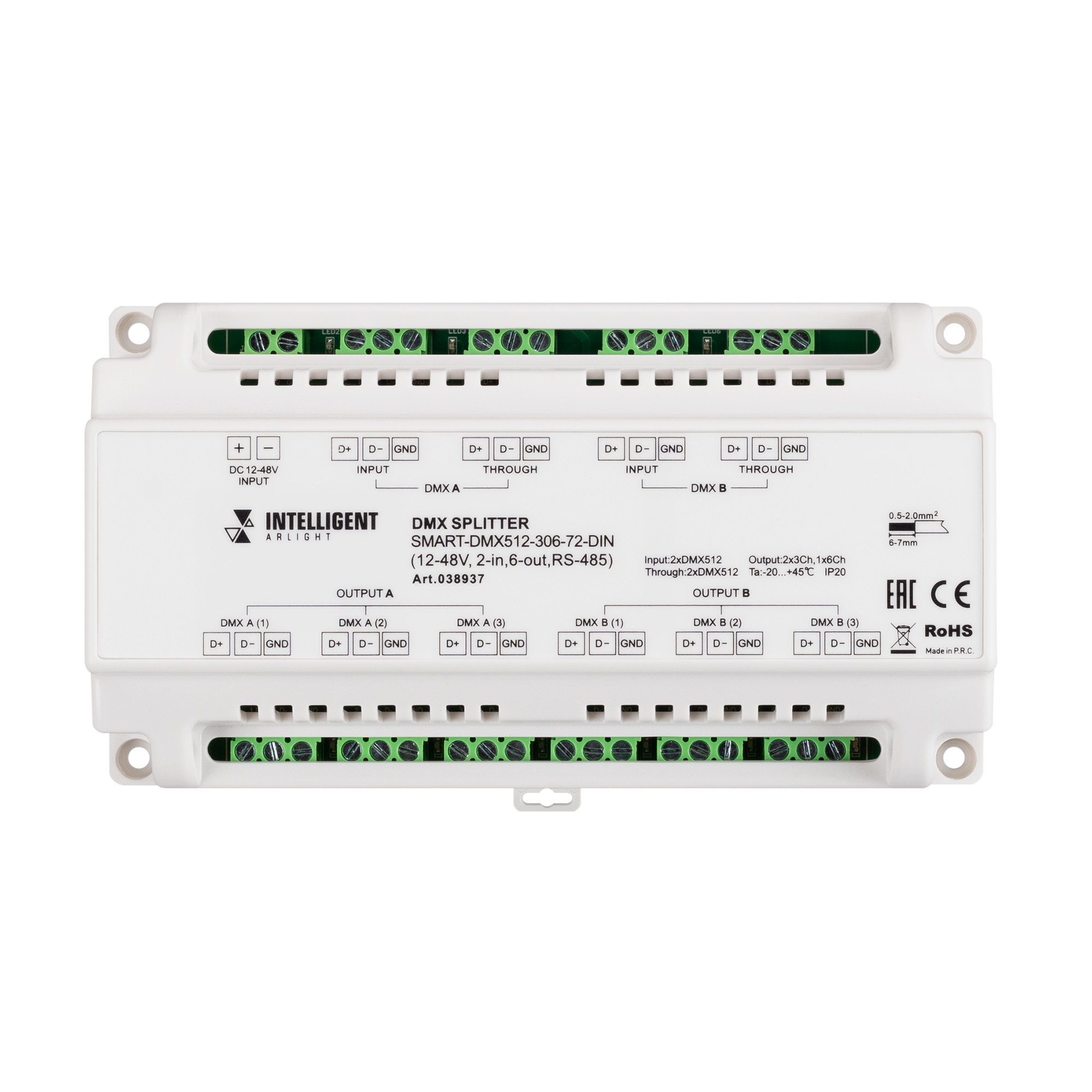 DMX-сплиттер, предназначенный для распределения DMX-сигнала и увеличения количества DMX-приемников, подключаемых к одному контроллеру. Позволяет распределять DMX-сигнал от одного источника на шесть линий (максимум по 32 приёмника на каждой линии) либо 2 DMX-сигнала по 3 линии для каждого, соответственно по 32 приёмника на каждую линию. Способствует увеличению дальности передачи сигнала при установке в середине линии. Имеет оптическую развязку между входом и всеми выходами, снижающую уровень помех на шинах DMX и уменьшающую вероятность выхода из строя оборудования при попадании высокого напряжения на шину. Устройство имеет на передней панели 9 индикаторов для отображения статусов питания, входных и выходных сигналов.