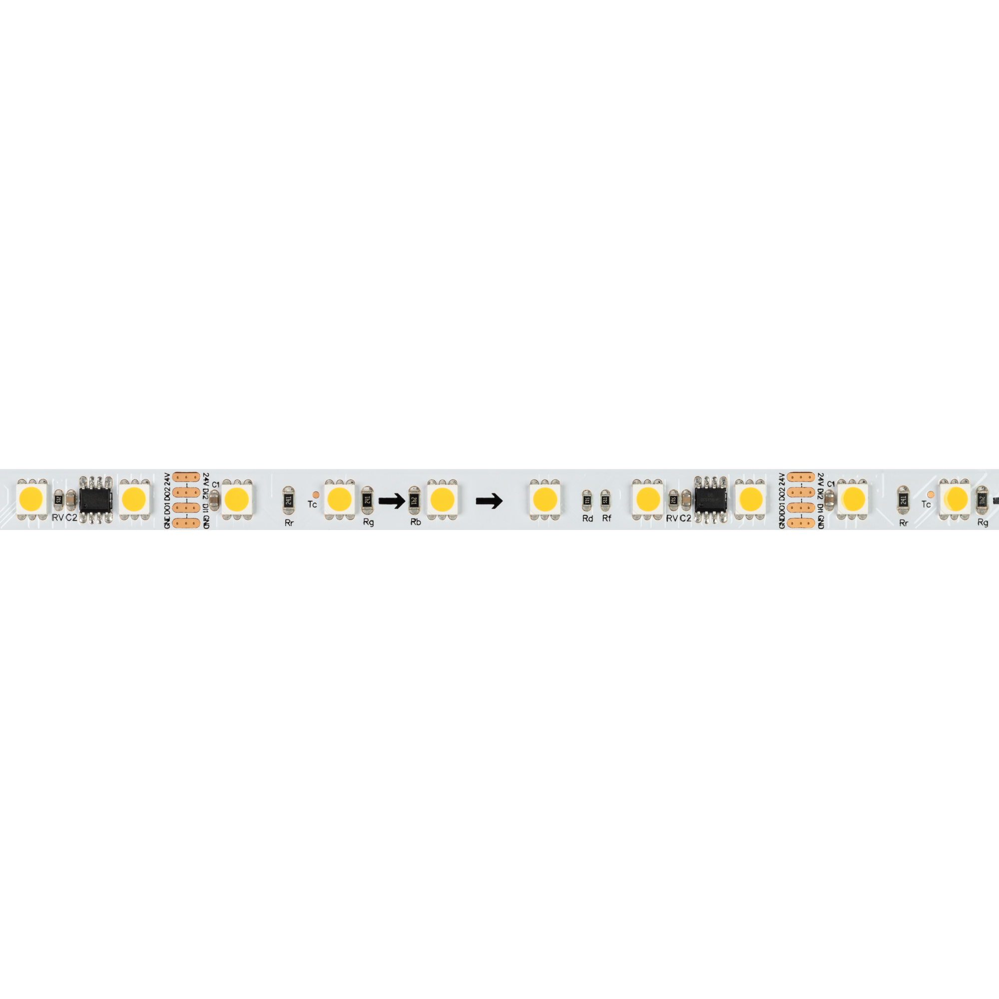 Светодиодная лента SPI серии B60 с микросхемой GS8206. Светодиоды SMD 5060, 60 шт/м, 10 pixels на 1 м (50 pixels на 5 м), 1 pixel = 6 светодиодов, белая плата шириной 10 мм, скотч 3М. Цвет ТЕПЛЫЙ 3000K, индекс цветопередачи CRI>80, угол 120°. Питание 24 В, мощность 15 Вт/м (75 Вт на 5 м). Размеры 5000x10x2.1 мм. Мин. отрезок 100 мм, 6 светодиодов. Цена за 1 м.