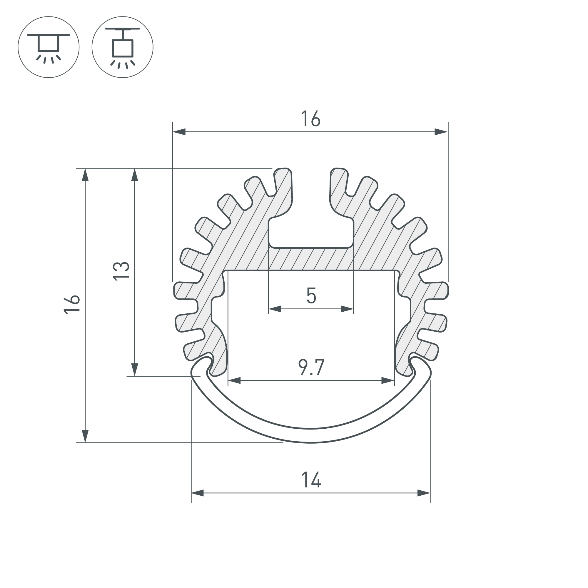 Накладной/подвесной профиль из анодированного алюминия для контурной подсветки элементов интерьера. Габаритные размеры профиля с полукруглым рассеивателем составляют 2000 мм в длину, 16 мм в ширину и 16 мм в высоту. Площадка для установки светодиодных лент позволяет использовать ленту шириной до 9,7 мм и мощностью до 12 Вт/м. Это обеспечивает гибкость в выборе светодиодных лент и создает потрясающие световые решения.