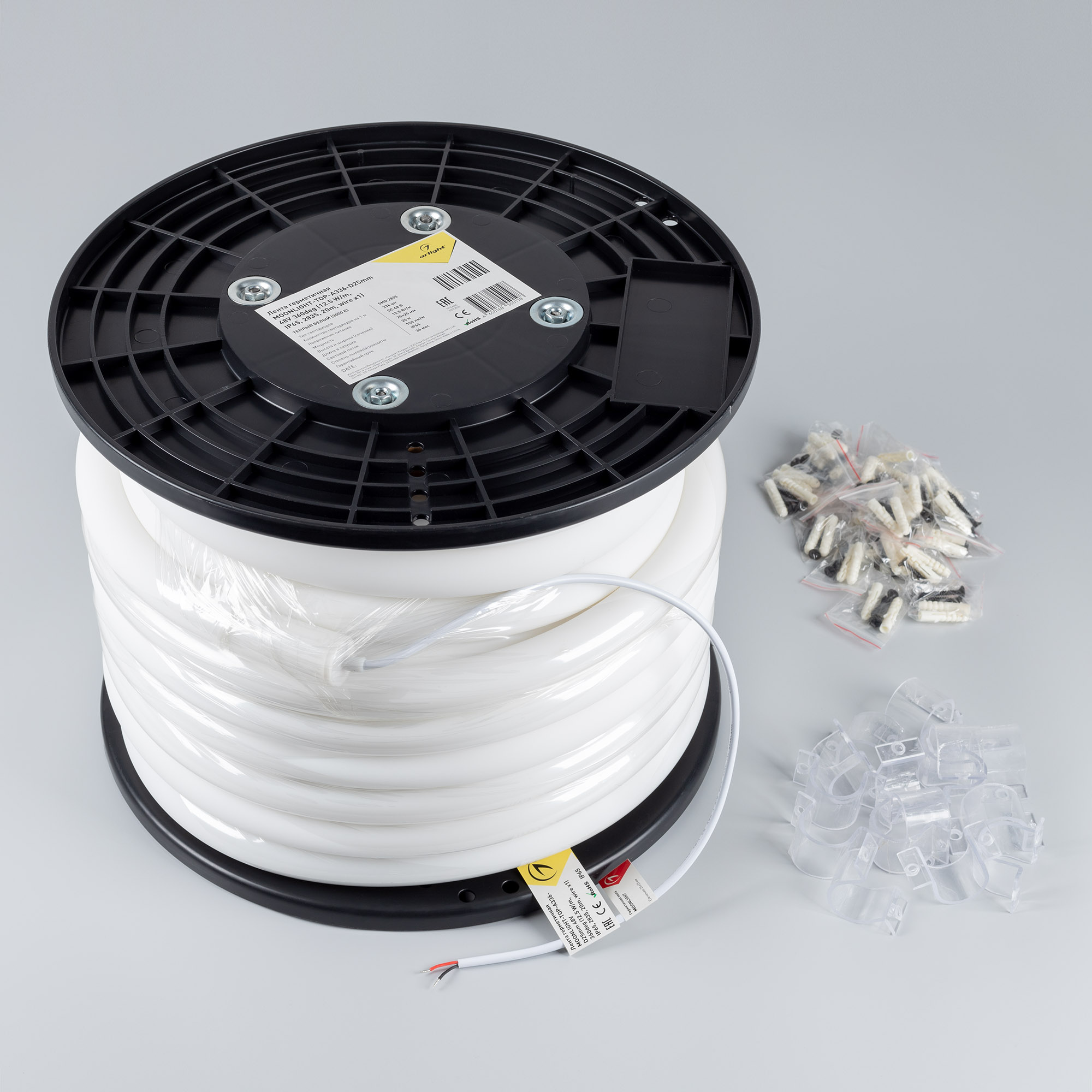 Гибкая герметичная лента (неон серии MOONLIGHT), сечение 25×25 мм. Светодиоды SMD 2835 336 шт/м. Цвет свечения ДНЕВНОЙ БЕЛЫЙ (4000 К), индекс цветопередачи CRI>90, световой поток 950 лм/м, угол излучения 360°. Мощность 12.5 Вт/м, питание 48 В. Класс пылевлагозащиты IP65. Размеры 20000×25×25 мм. Резка не предусмотрена. Изгиб согласно метки на корпусе, минимальный радиус изгиба 150 мм. Кабель питания длиной 500 мм, вывод с одной стороны вдоль линии сечения неона. Катушка 20 м. Цена за 1 м. Гарантия 3 года.