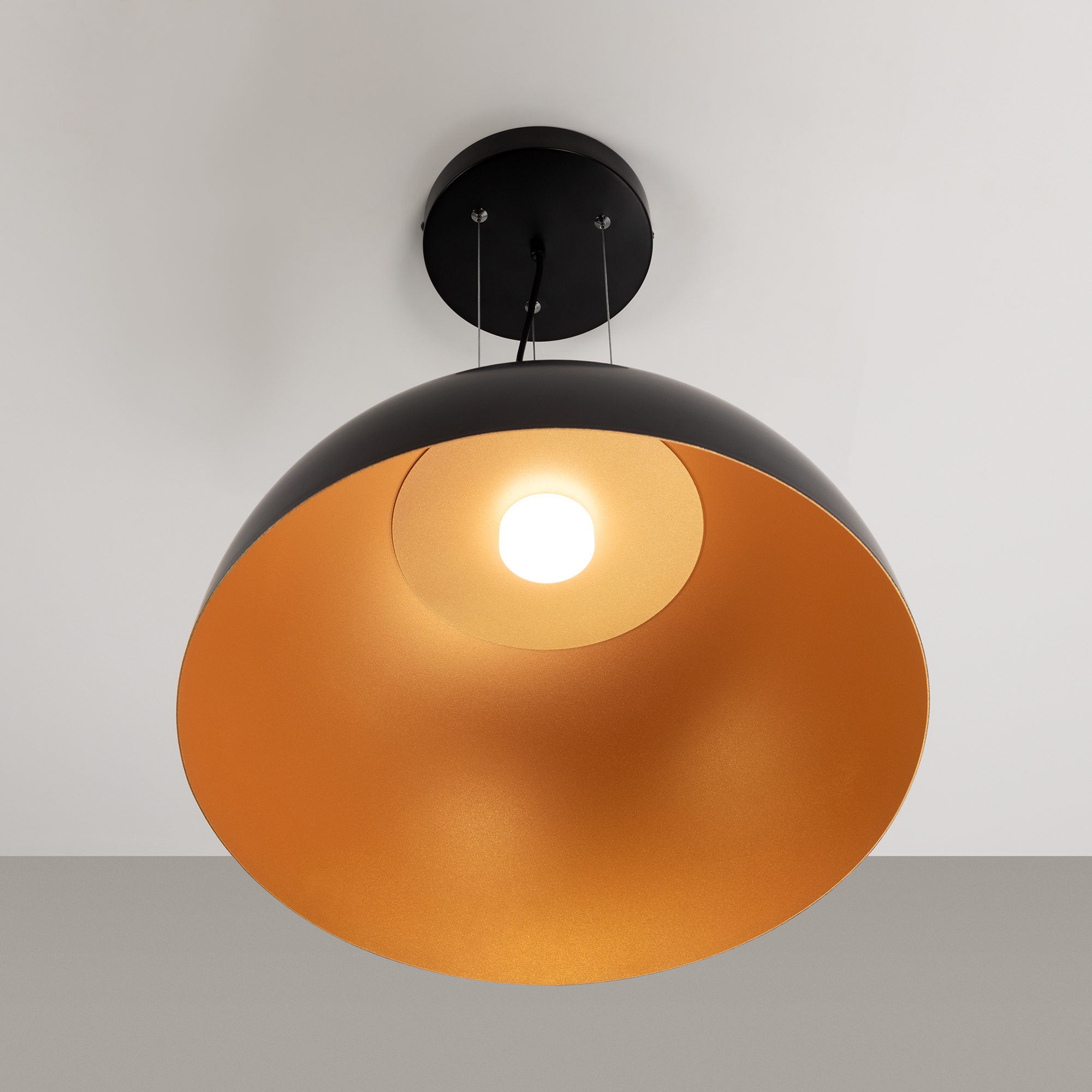 Подвесной светильник. Мощность 30 Вт, св. поток 1900 лм, 55 лм/Вт, теплый 3000 K, CRI>90, угол 100°, напряжение питания 230 В. Черный круглый корпус из алюминия, степень защиты IP20. Размер: диаметр 500 мм, высота 250 мм, размер чаши: диаметр 200 мм, высота 35 мм. Монтаж подвесной, длина подвеса 1500 мм. Драйвер 24-42 В, 900 мА, пульсация <5%.