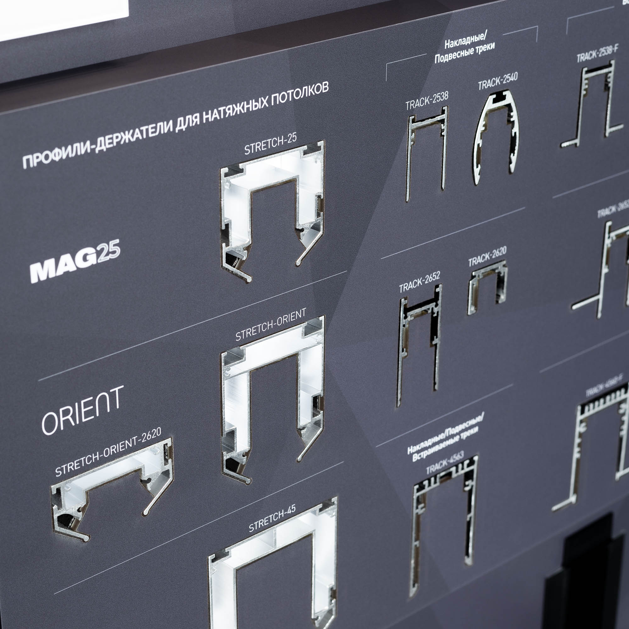 Отображена полная линейка треков для данных систем: подвесные, накладные и встраиваемые модели.